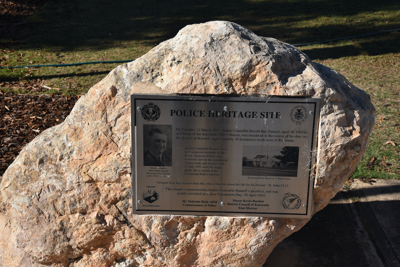 There is also a Police Heritage site memorial in Karoonda. It is to honour Senior Constable Harold Rae Pannell who was murdered in the course of his duty.