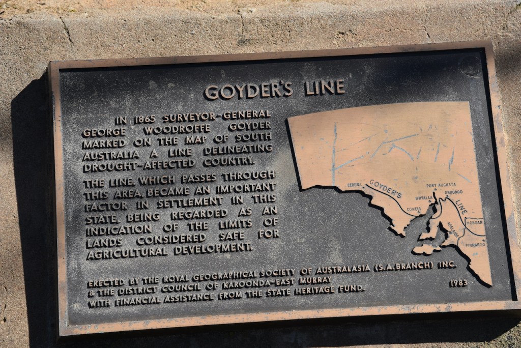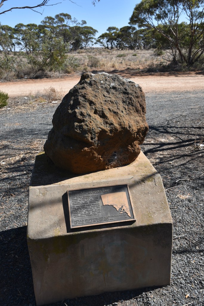 A little further along the Highway we stopped to have a look at the Goyder’s Line moument. Goyder’s Line was created in 1865 by Surveyor-General George Woodroofe Goyder. It is an ‘imaginary’ line that runs roughly east–west across South Australia and, in effect, joins places with an average annual rainfall of 10 inches (250 mm). To the north of Goyder’s Line, annual rainfall is usually too low to support cropping, with the land being only suitable for grazing. Related to that, the line also marks a distinct change in vegetation. To the south, it is composed mainly of mallee scrub, whilst saltbush predominates to the north of the line.