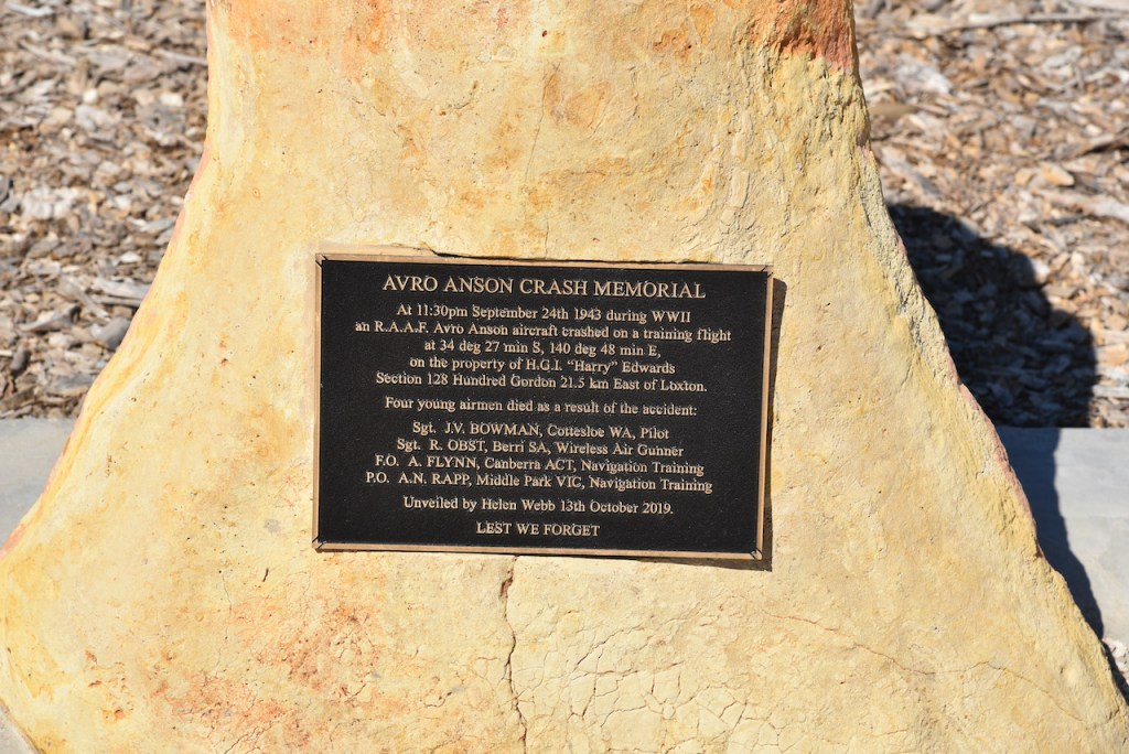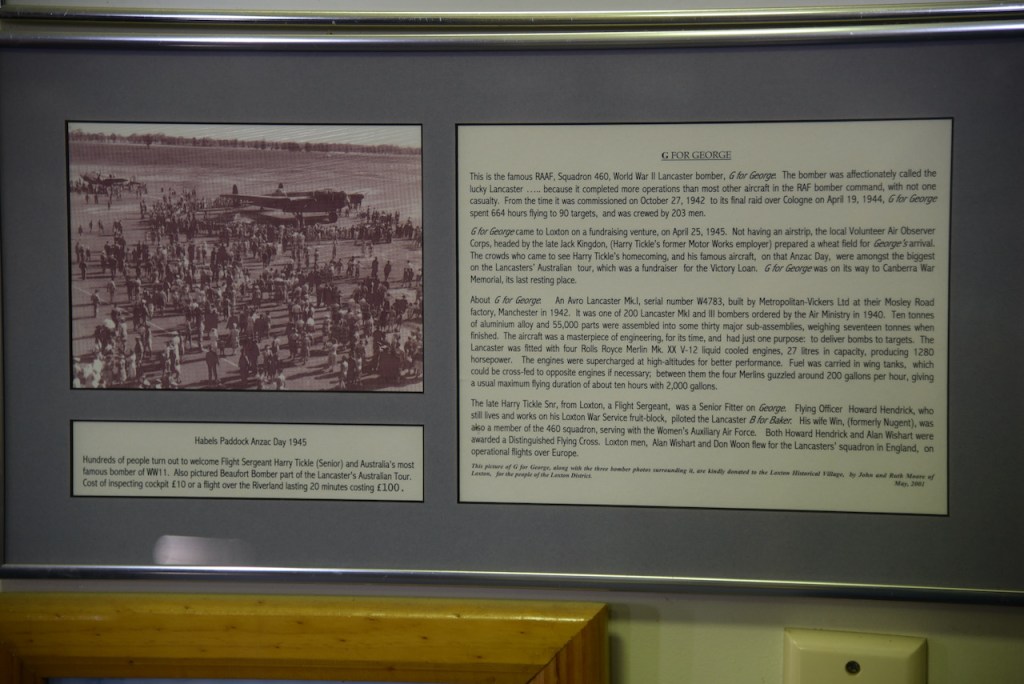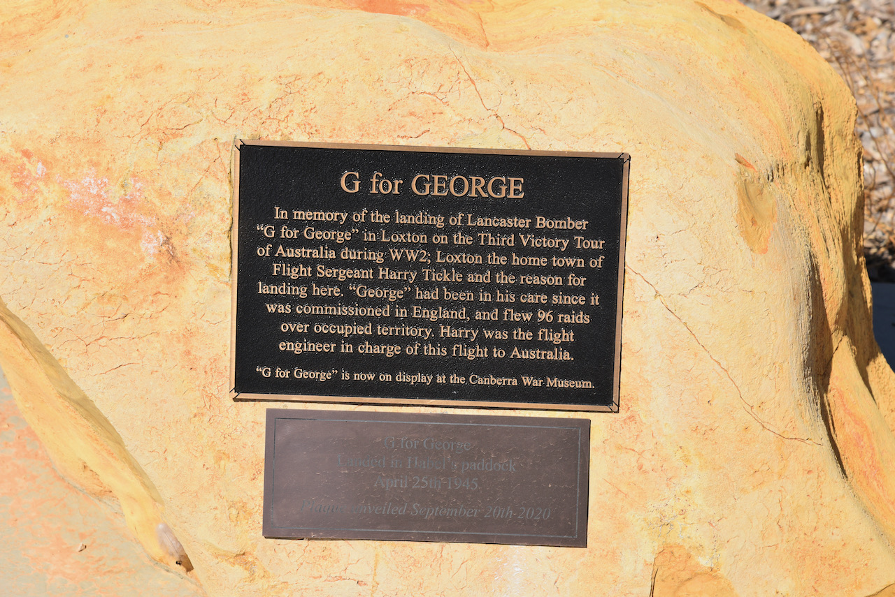 There is also a plaque commemorating the land of Lancaster Bomber ‘G for George’ in Loxton on the Third Victoru Tour of Australia during the Second World War.