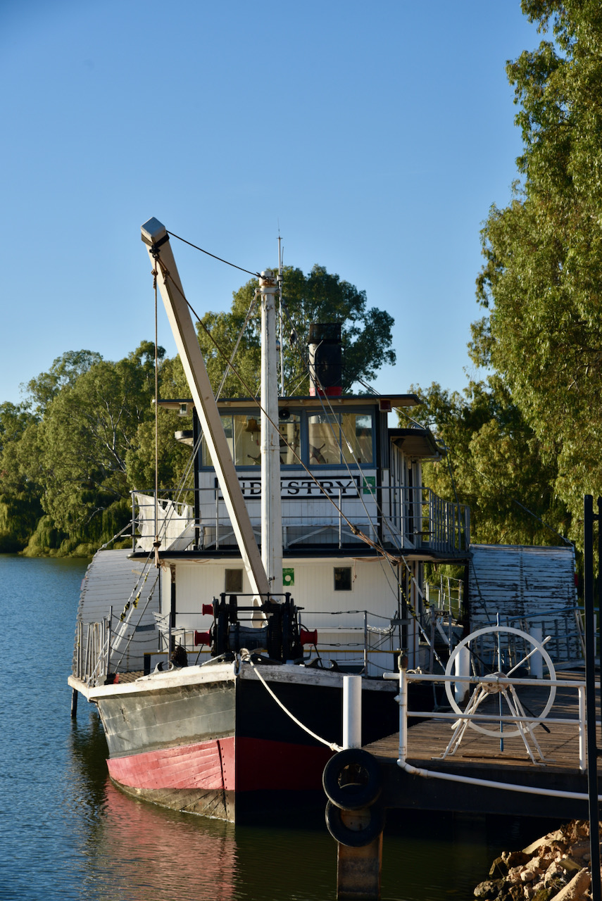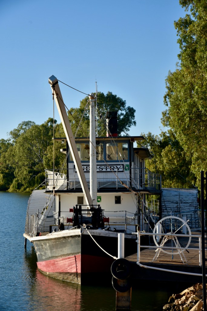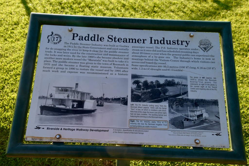 We had a quick look at the old paddle steamer Industry which is moored at Renmark. It was built at Goolwa in 1911 and used initially for the de-snagging of the Murray River to keep it clear for the paddle steamer trade. By the late 1960s the Industry had become obsolete and became a floating static museum. Between 1990 and 1995 the vessel was restored and recommissioned as a historic passenger vessel.