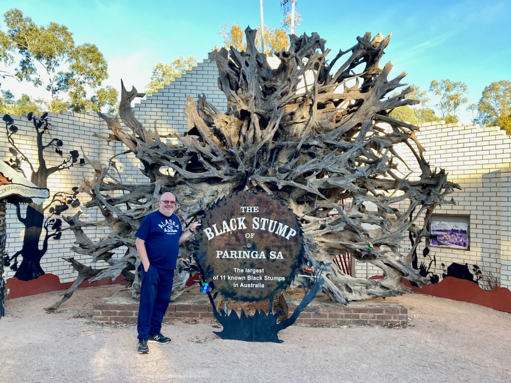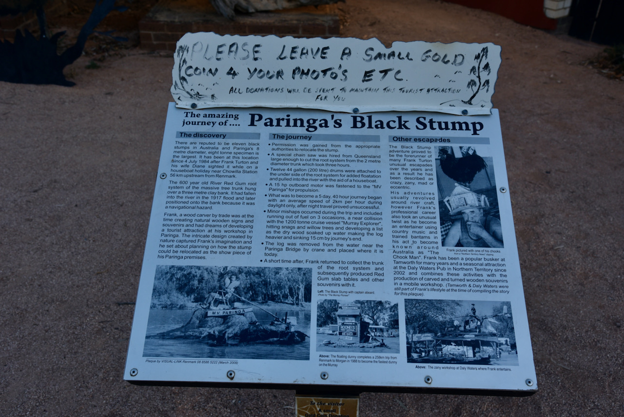 We had a look at the Black Stump at Paringa. The 600 year old River Red Gum root stump had hung over a clay bank on the River Murray and had fallen into the river during the 1917 flood. It was considered a navigational hazard and permission was granted from the authorities to relocate the stump.