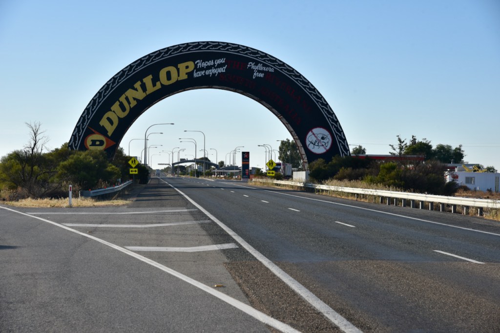Marija and I then headed east out of Paringa on the Sturt Highway and we soon reached the fruit fly roadblock at Yamba near the South Australia/Victoria State border. When travelling west into South Australia it is a mandatory stop at the checkpoint. It is a biosecurity checkpoint as fruit is not permitted to be carried into South Australia. This is to preserve the state’s fruit-fly-free status and has operated since 1957. Also at this location is a large advertisement for Dunlop in the shape of a vehicle tyre.