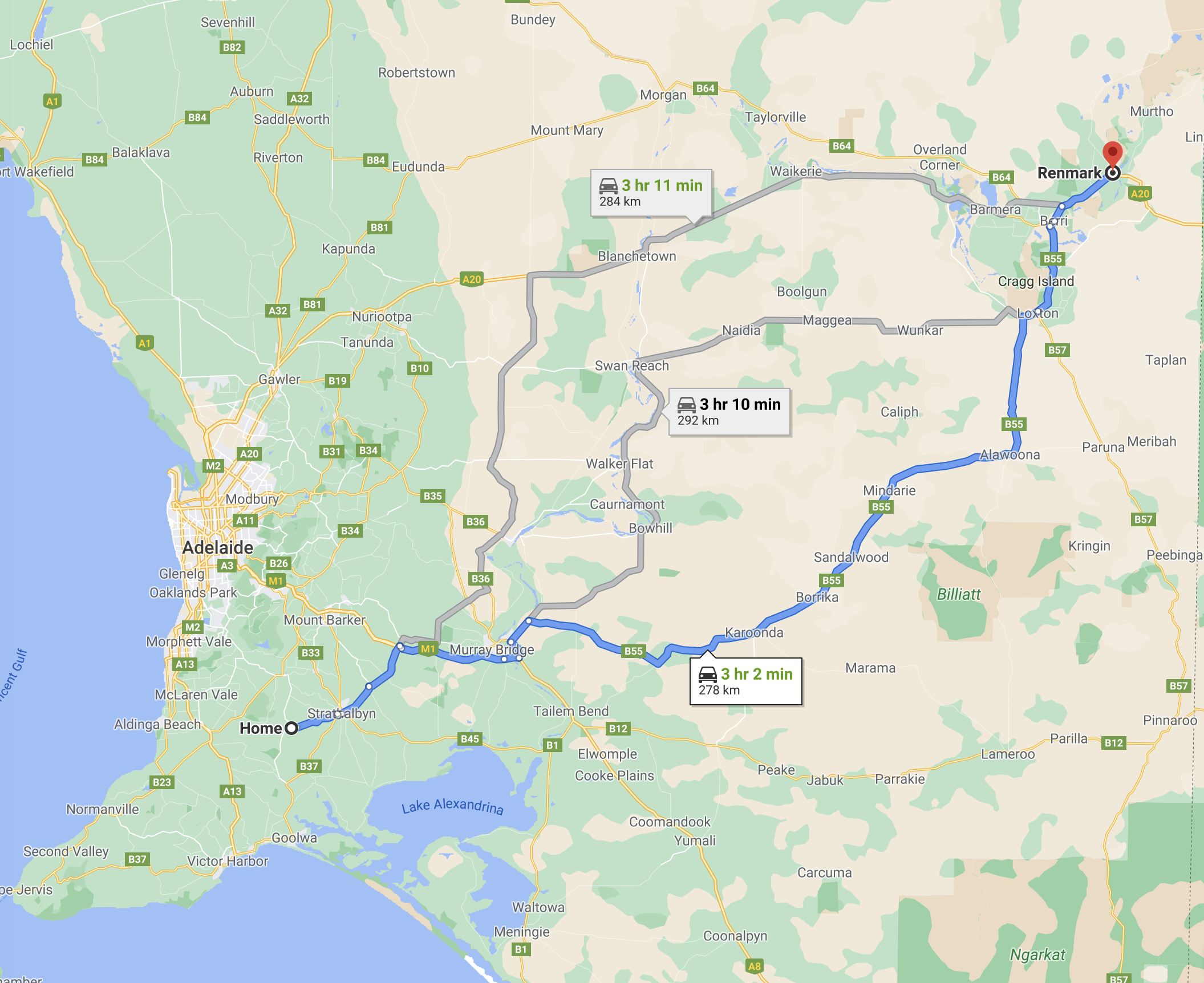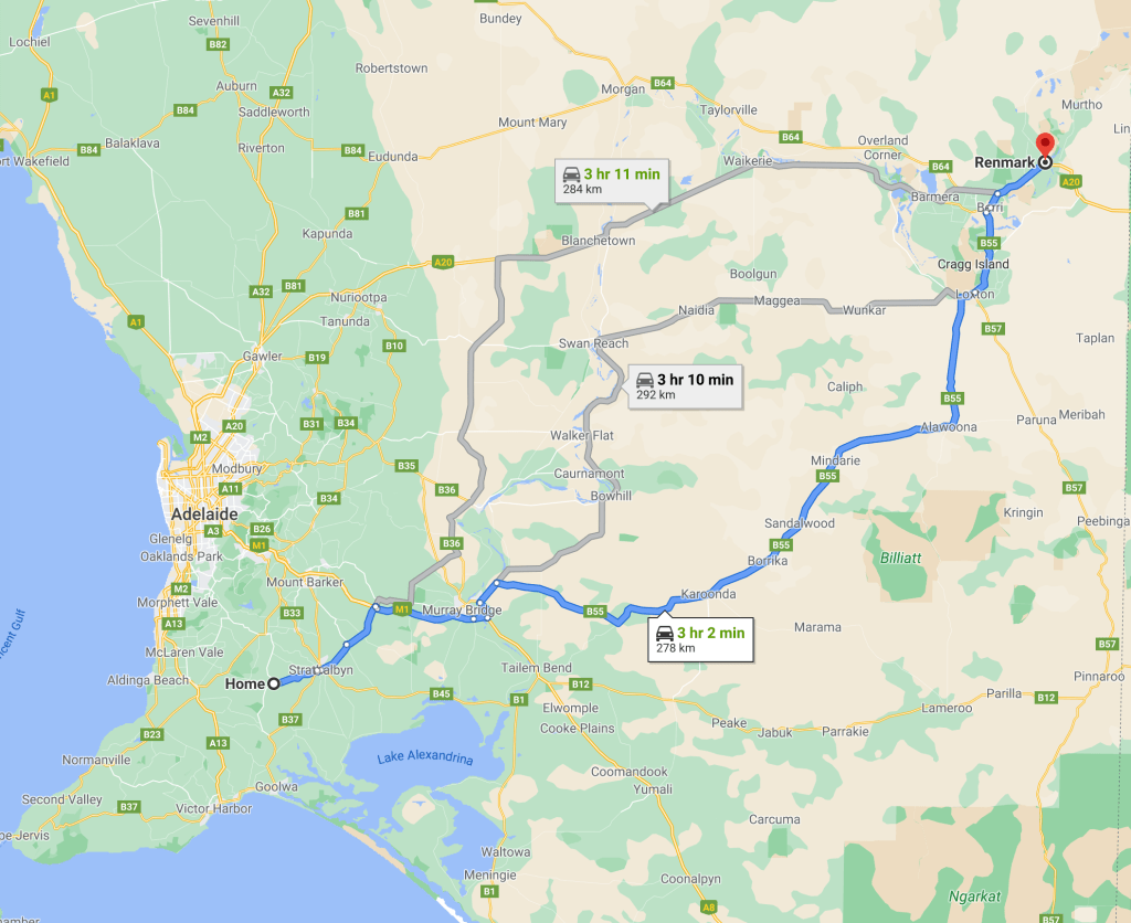 Above:- Map showing our route from Ashbourne to Renmark in the Riverland. Map c/o Google maps