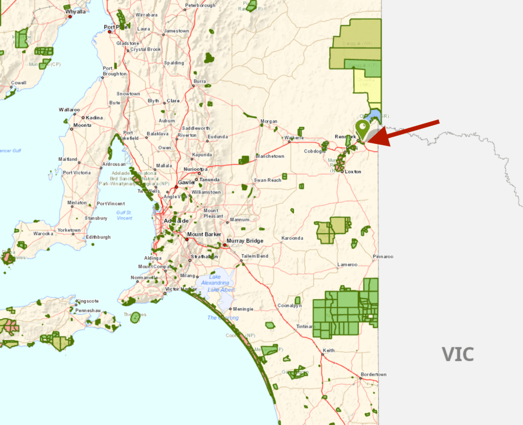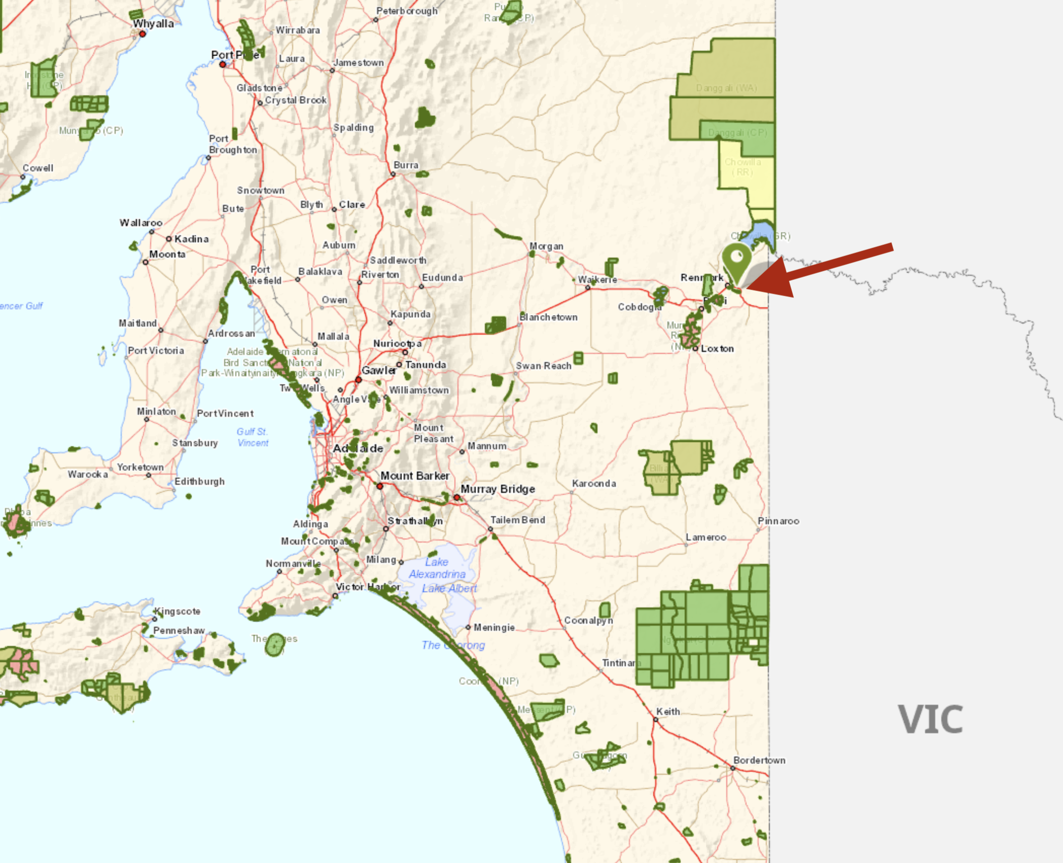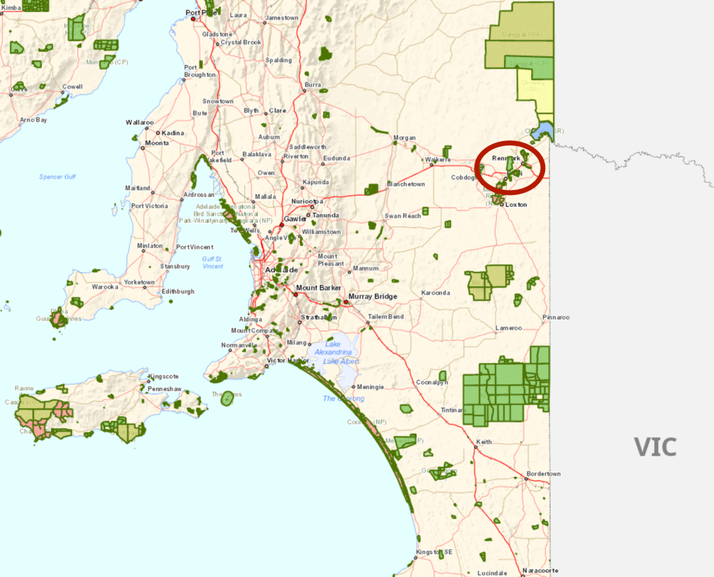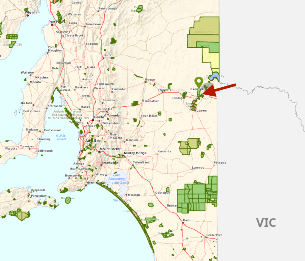 Above:- Map showing the location of the Murray River National Park, north-east of the city of Adelaide near the Victorian State border. Map c/o Location SA Map Viewer.