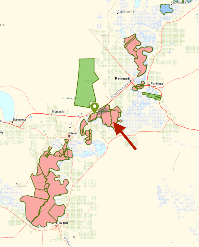 Above:- Map showing the sections of the Murray River National Park. The arrow indicates the Lyrup Flats section where we operated from. Map c/o Location SA Map Viewer.