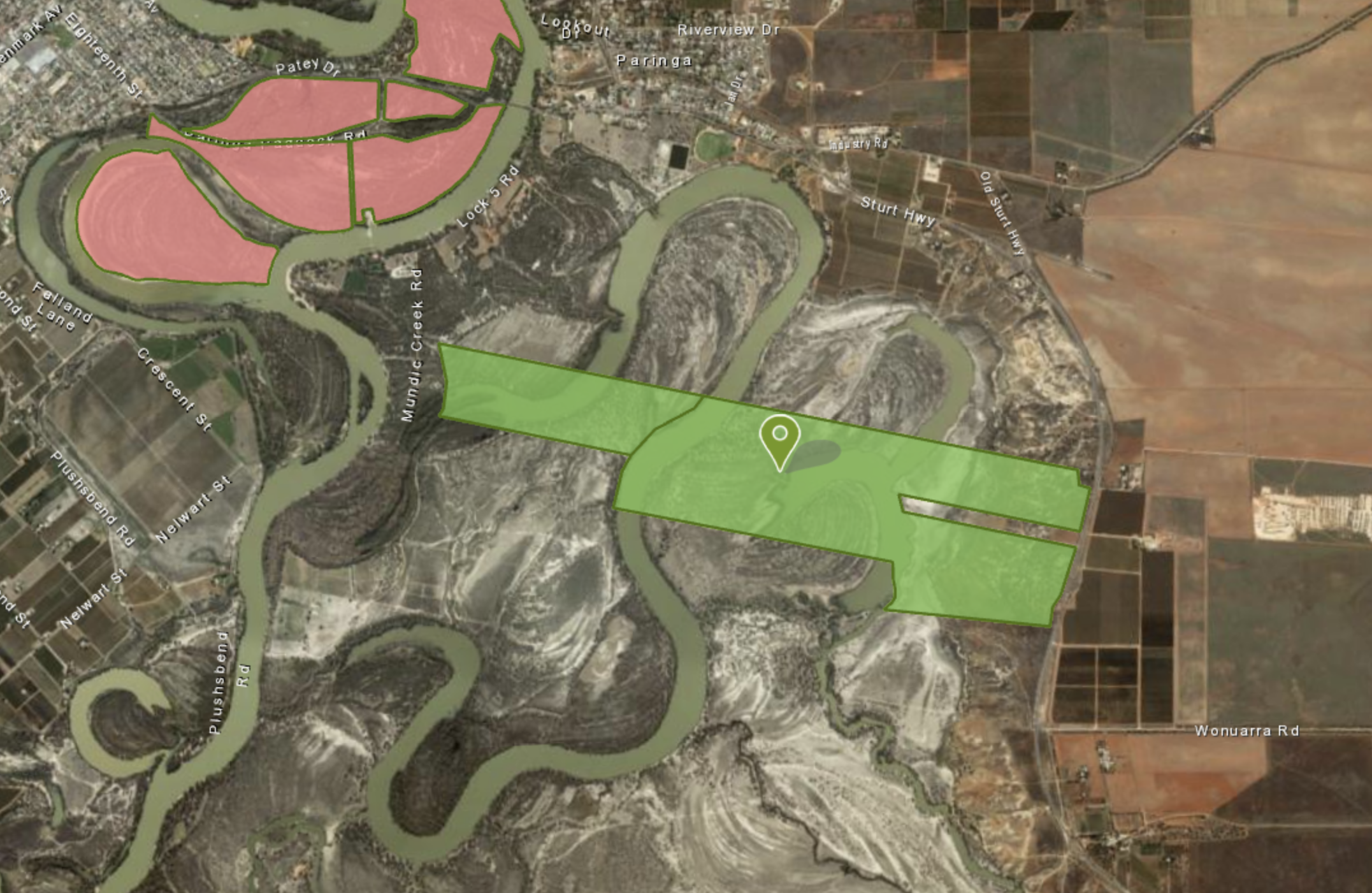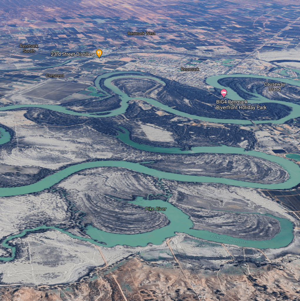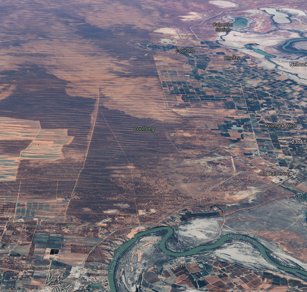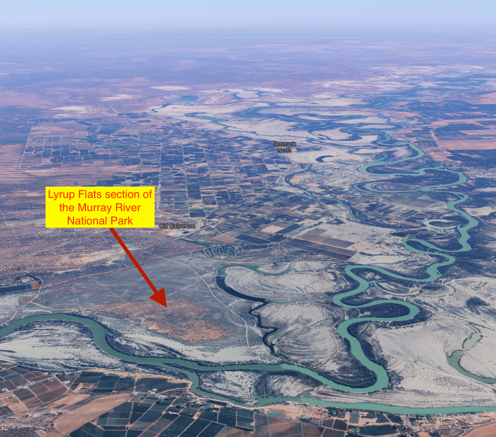 Above: An aerial view of the Lyrup Flats section of the Murray River National Park. Image c/o Google maps