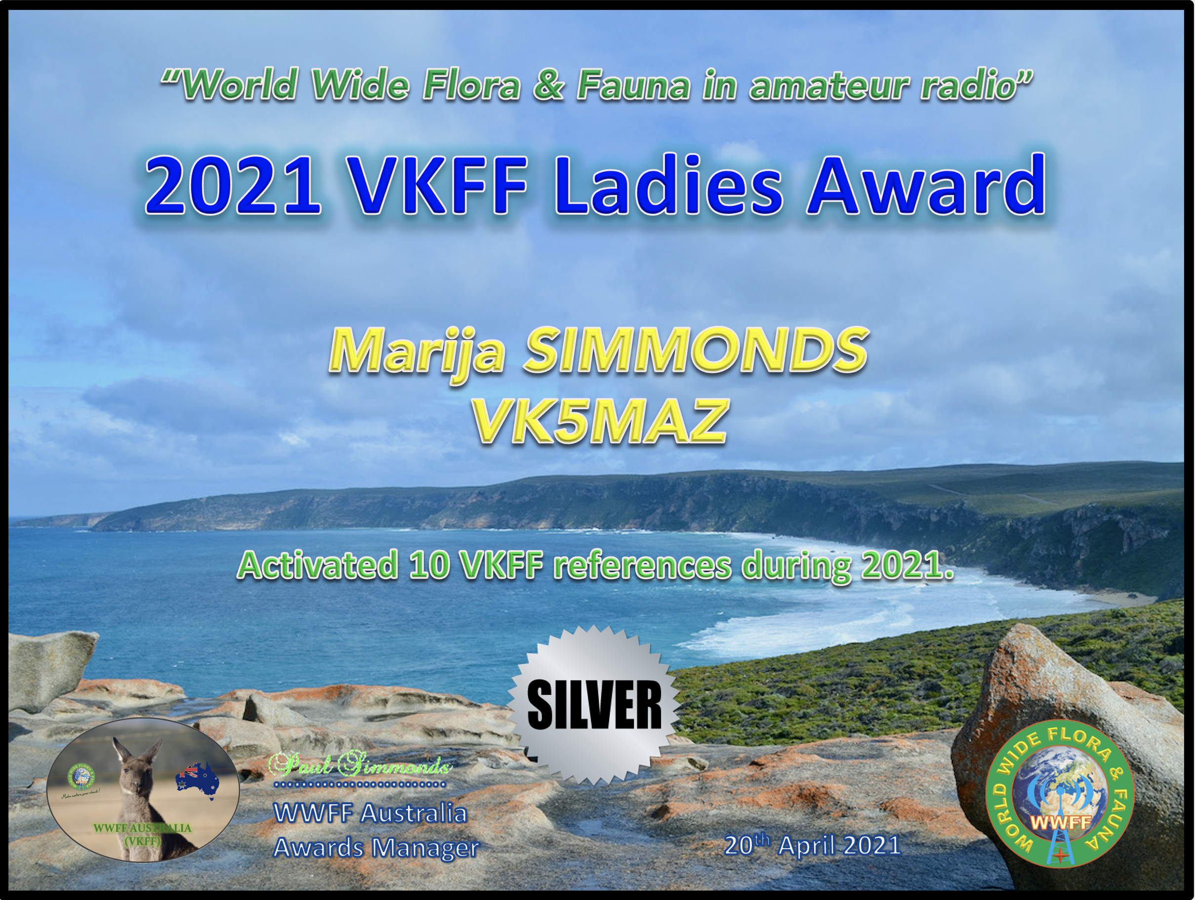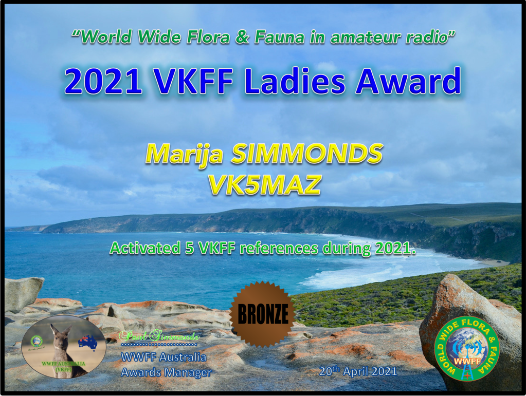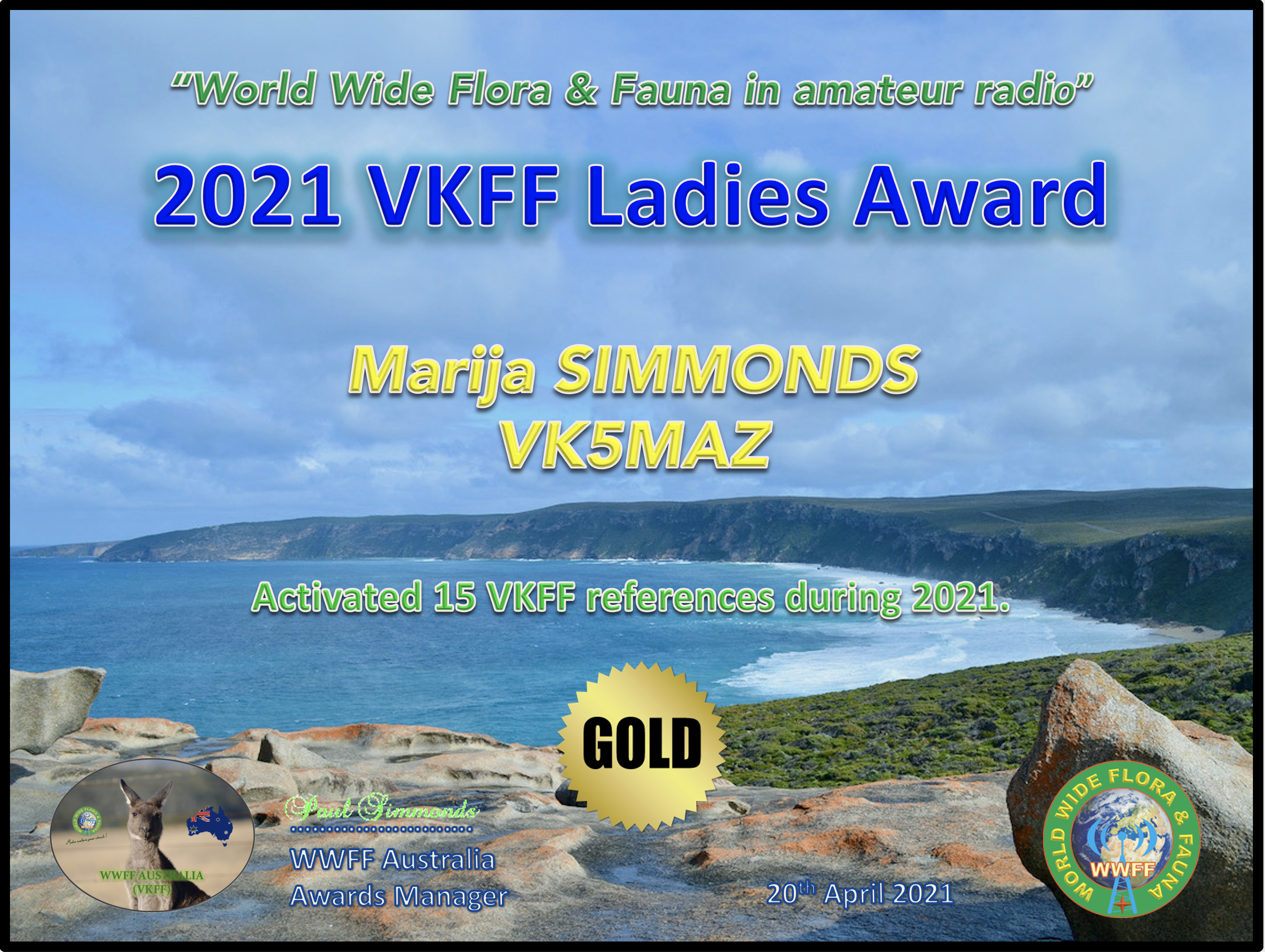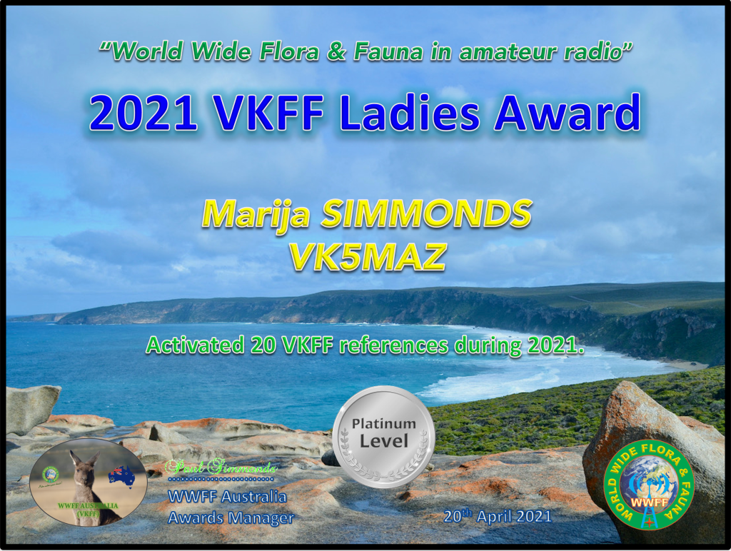 Following our trip to VK2 and VK3, Marija VK5MAZ has qualified for the Bronze, Silver, Gold, & Platinum Activator certificates for the 2021 VKFF Ladies Award.