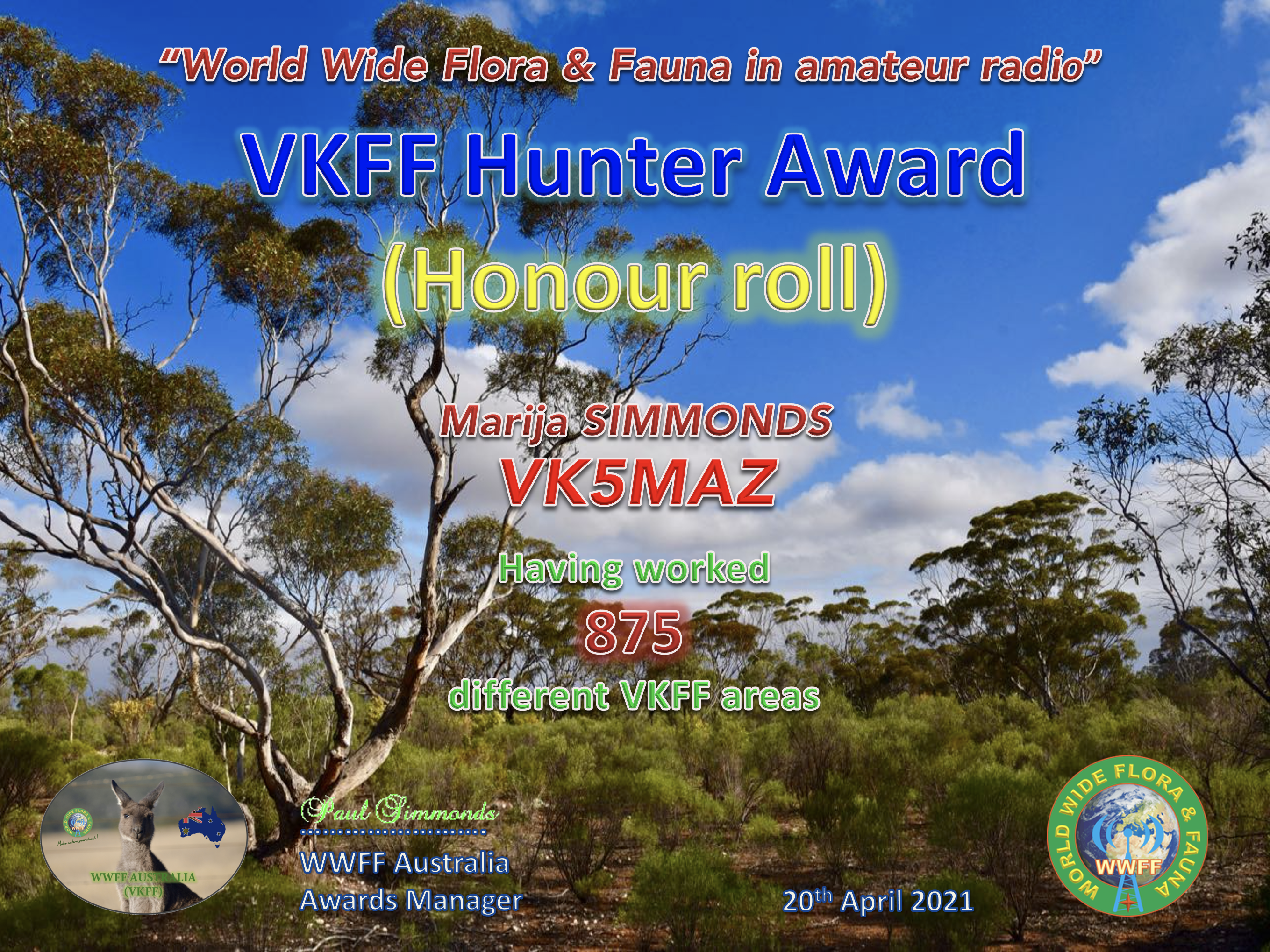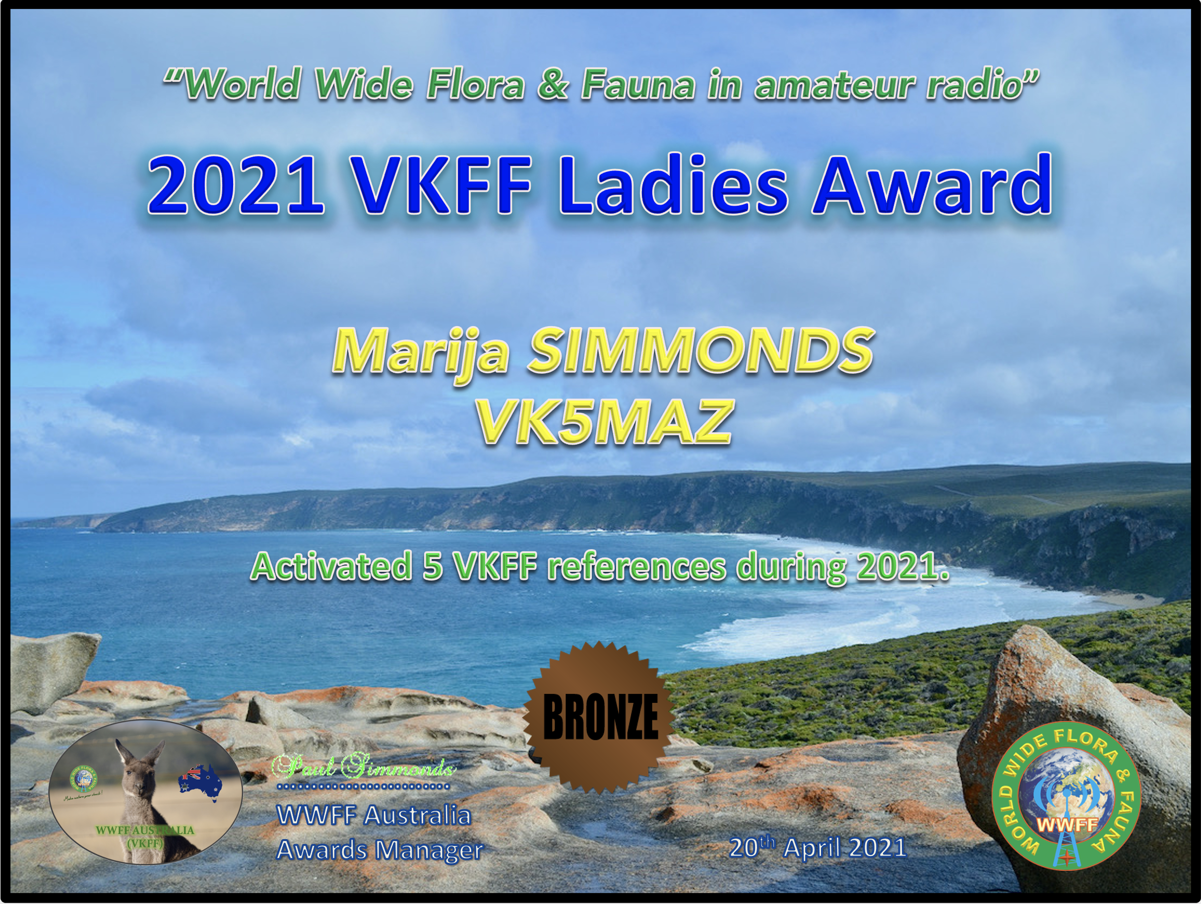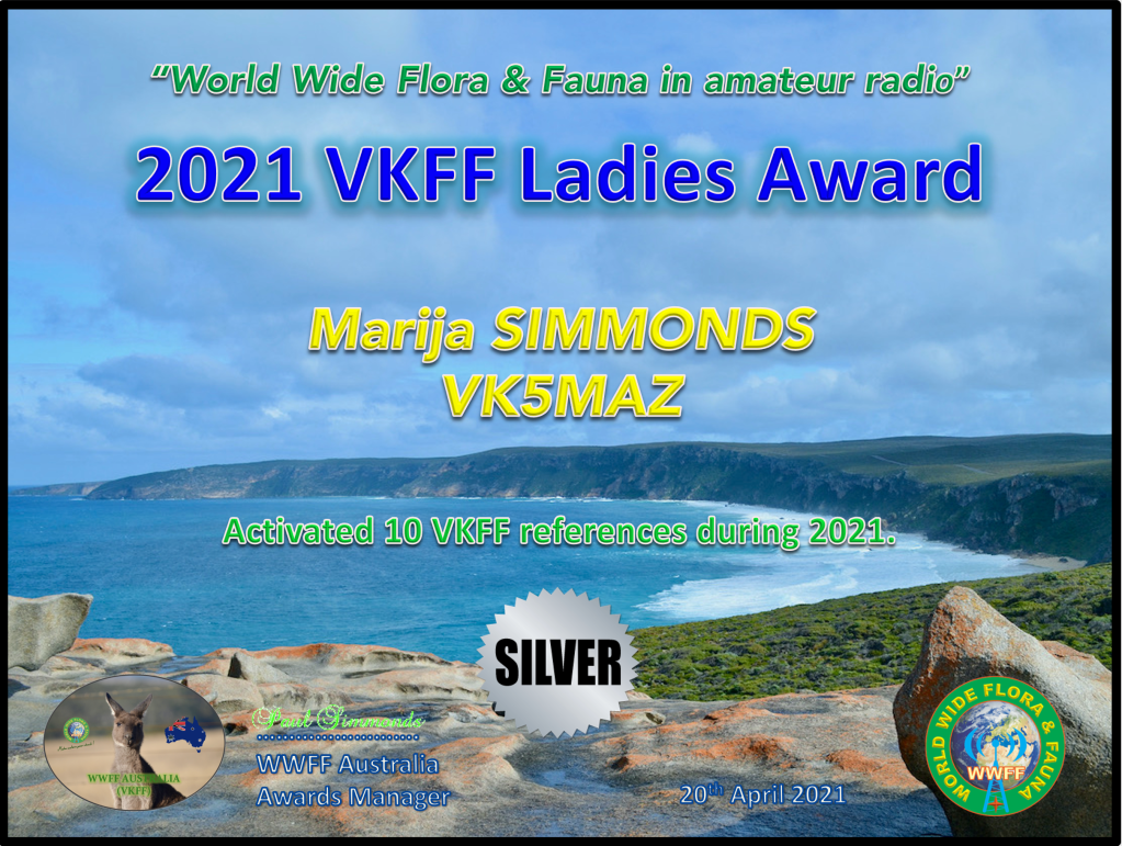 Following our trip to VK2 and VK3, Marija VK5MAZ has qualified for the Bronze, Silver, Gold, & Platinum Activator certificates for the 2021 VKFF Ladies Award.