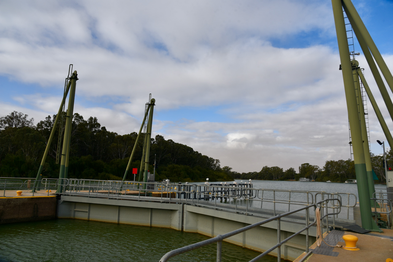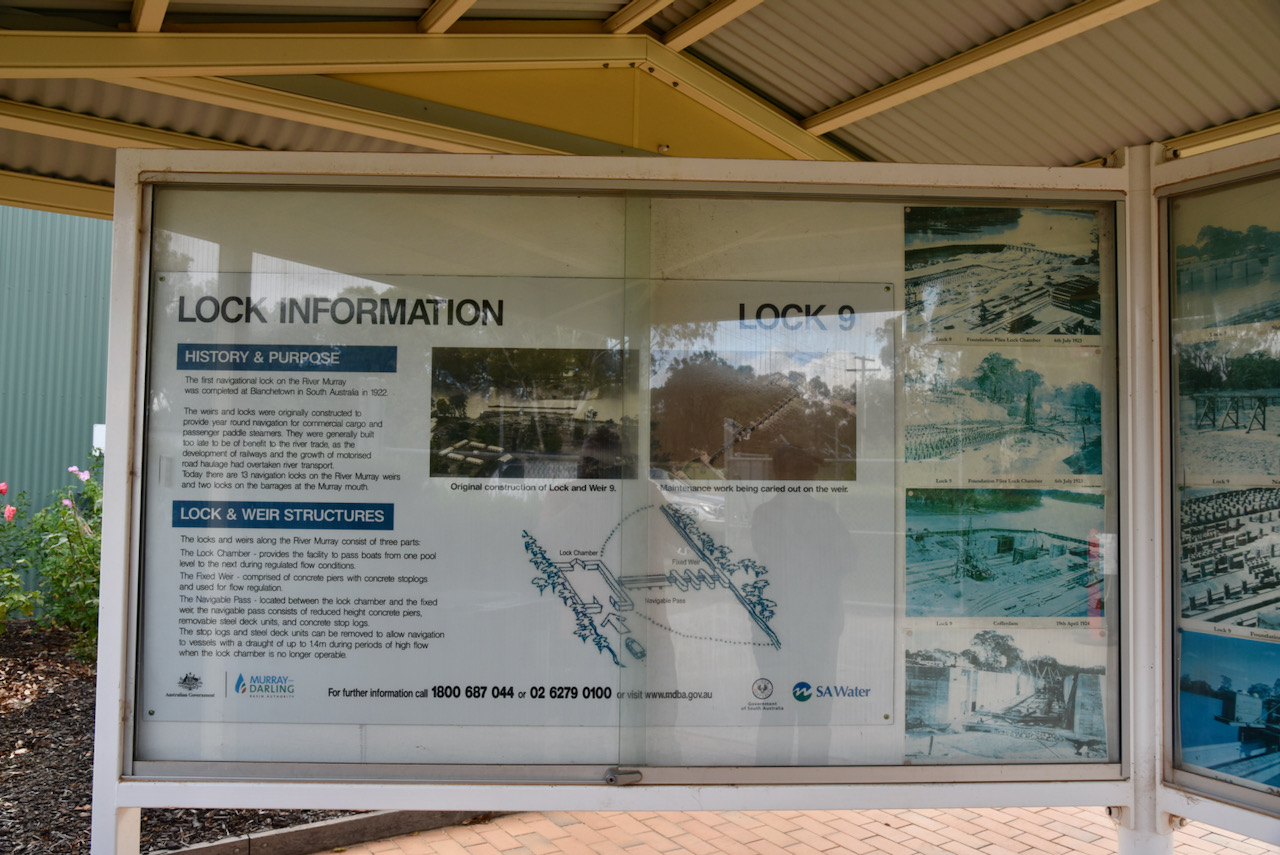 Our next stop was Lock 9 on the Murray River. The first navigational lock on the Murray River was completed at Blanchetown in South Australia in 1922. The weirs and locks were originally constructed to provide year round navigation for commercial cargo and passenger paddle steamers. They were generally built too late to be of benefit to the river trade, as the development of railways and the growth of motorised road haulage had overtaken river transport. Today there are 13 navigation locks on the Murray River.