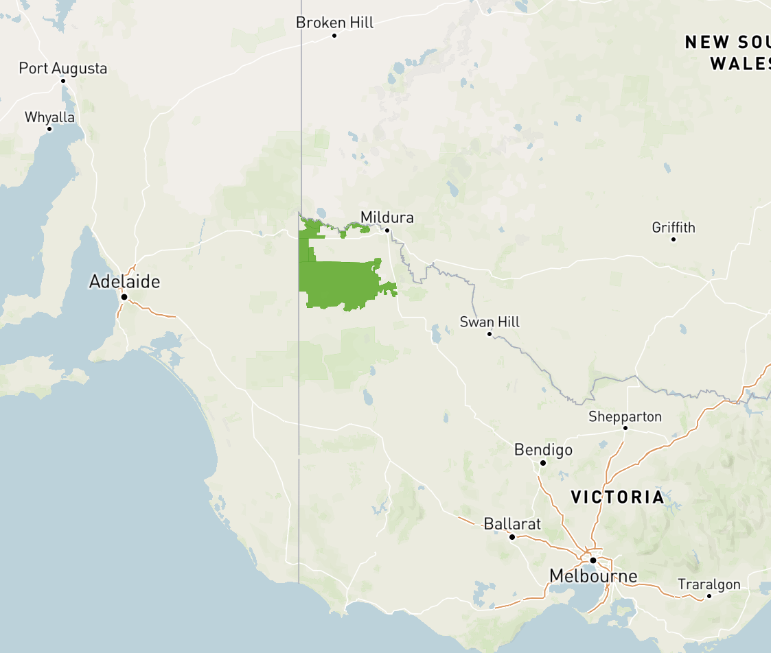 The Murray-Sunset National Park is the second-largest National Park in Victoria and comprises an area of 633,000 hectares (1,560,000 acres). The park which borders the South Australia State border is located about 440km north-west of Melbourne. The Sturt Highway passes through the northern section of the park. Most of the park is in the remote area between the Sturt Highway and the Mallee Highway.