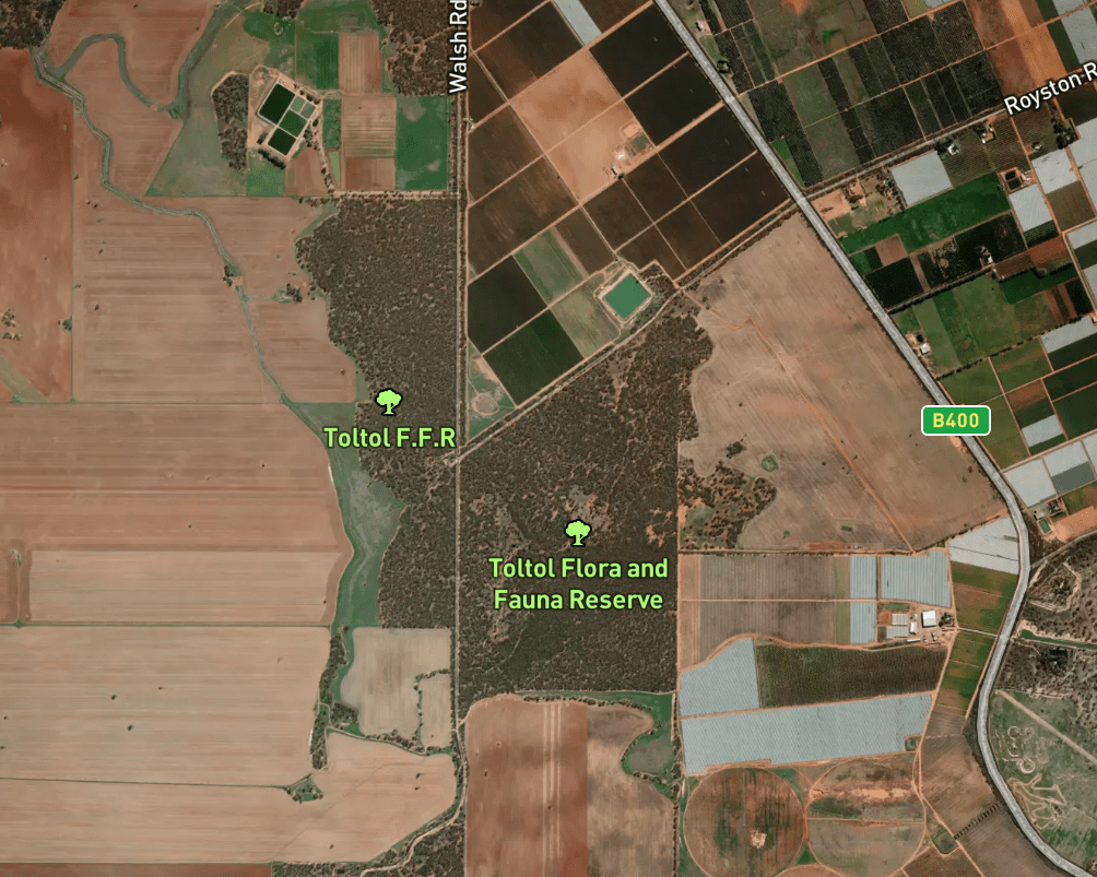 The Tol Tol Flora & Fauna Reserve is 2.62 km² in size and was established in 2009. The park takes its name from the locality of Tol Tol. The Tol Tol Post office was open between 1924 and 1926.
