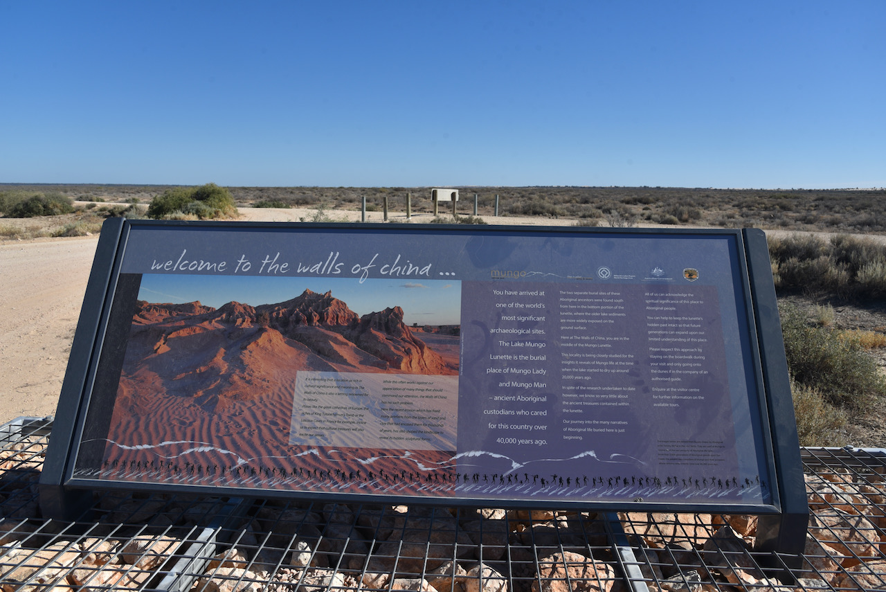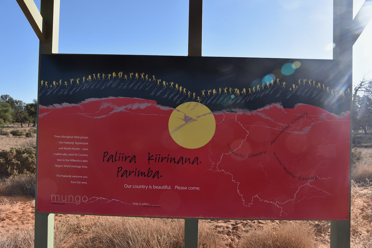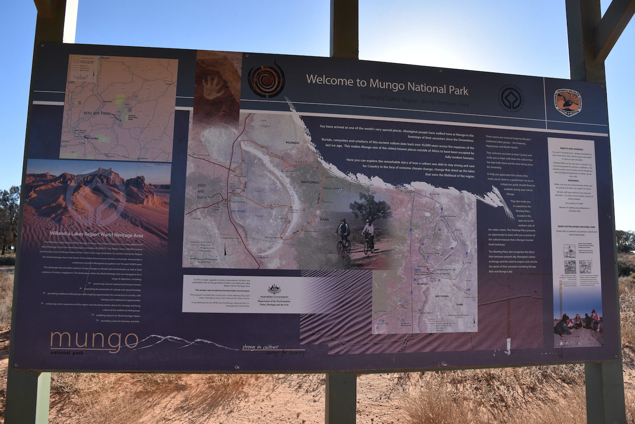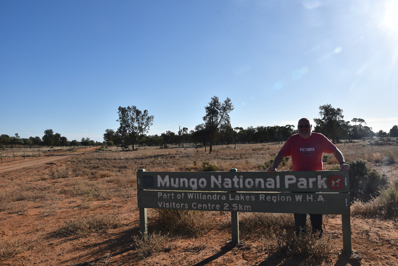 After about 90 minutes we reached the Mungo National Park and stopped briefly at the information board and the park sign for a photo.