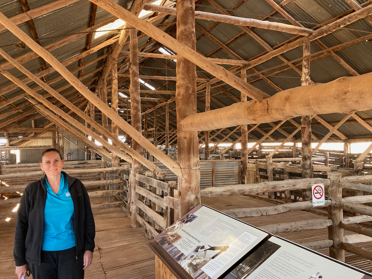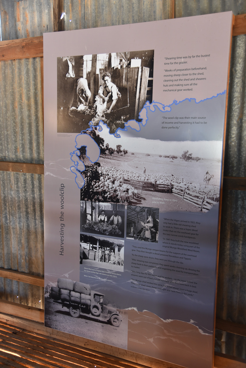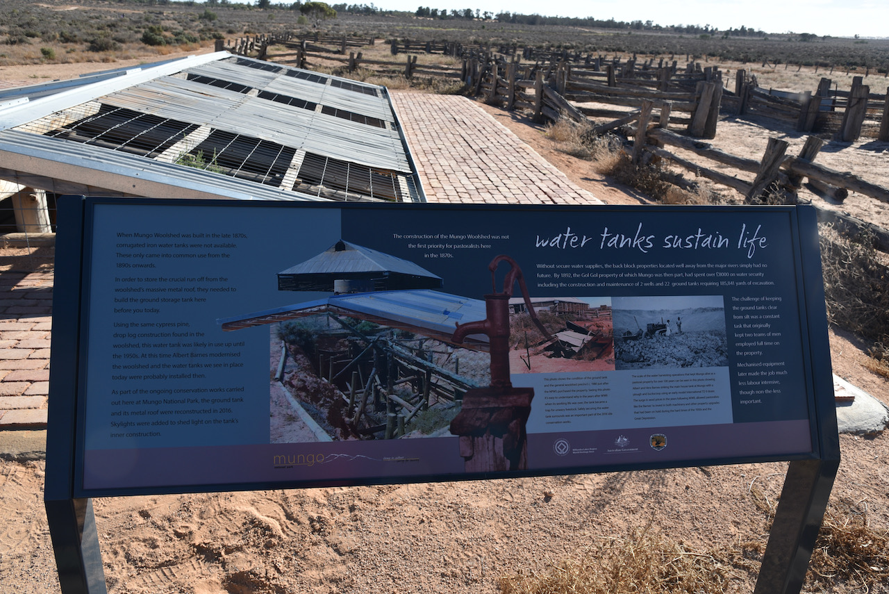 We then walked outside to have a look at the Mungo Woolshed. When Mungo Woolshed was built in the late 1860s corrugated iron water tanks were not available. These only came into common use from the 1890s onwards. In order to store the crucial run off from the wooldshed’s massive metal roof, they needed to build the ground storage tank which can be seen today.