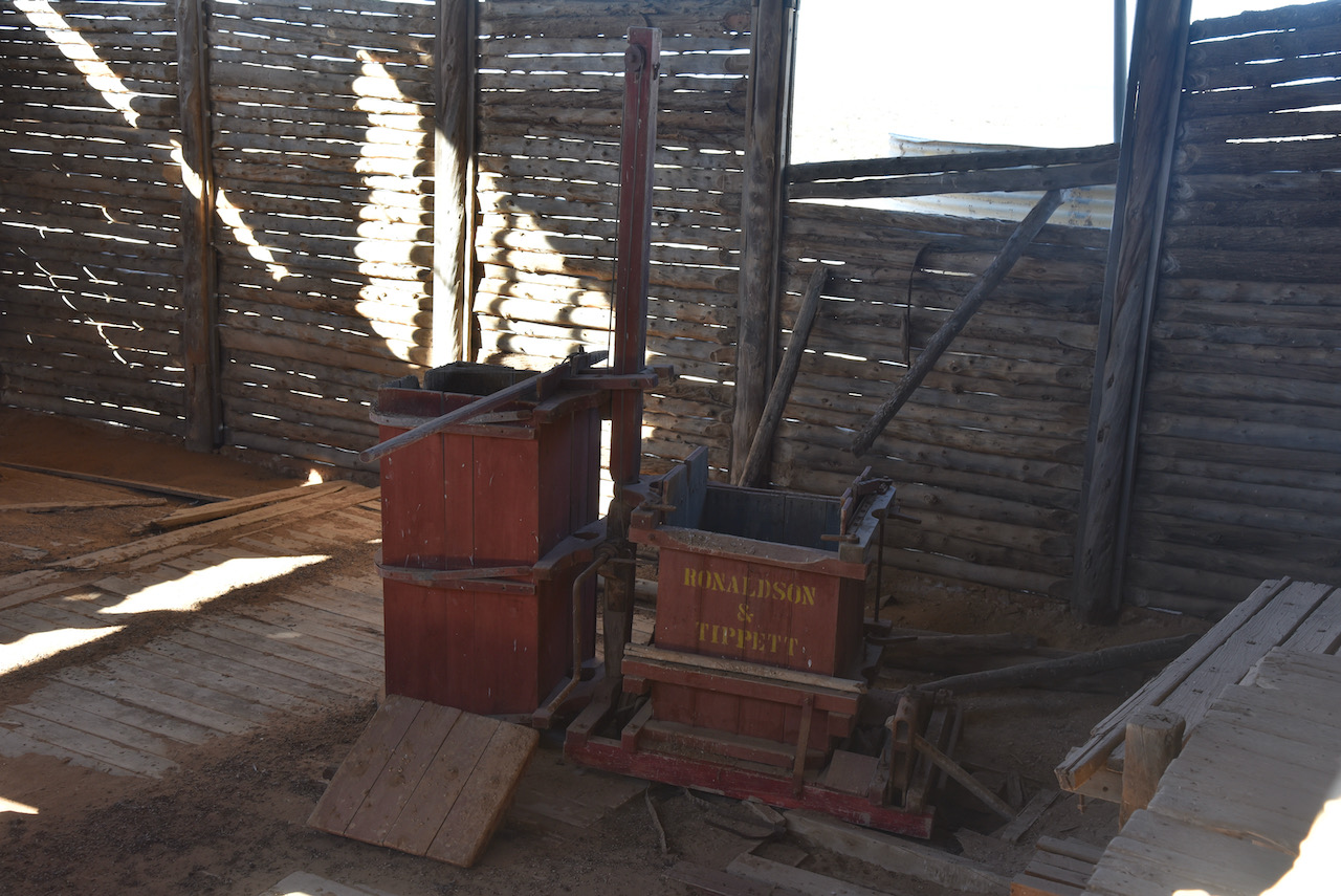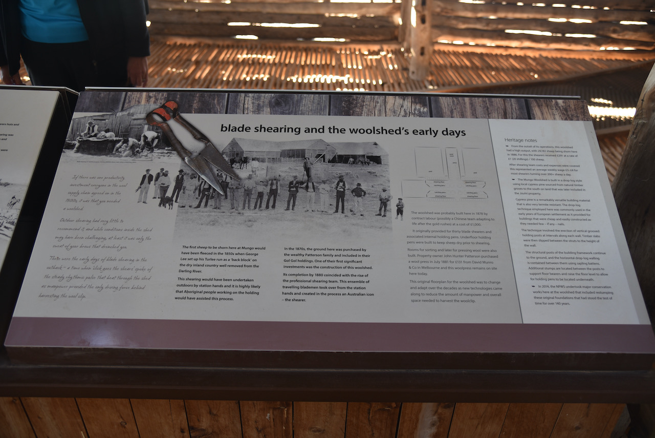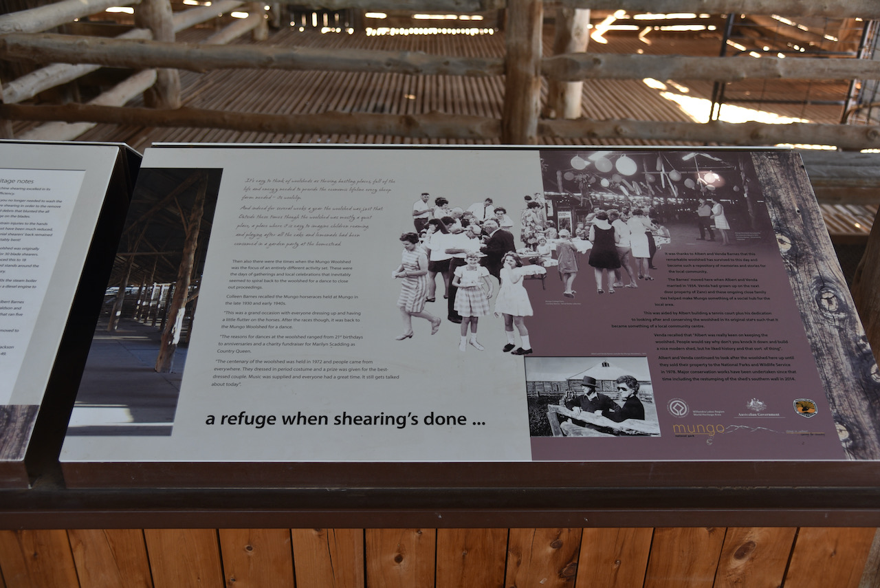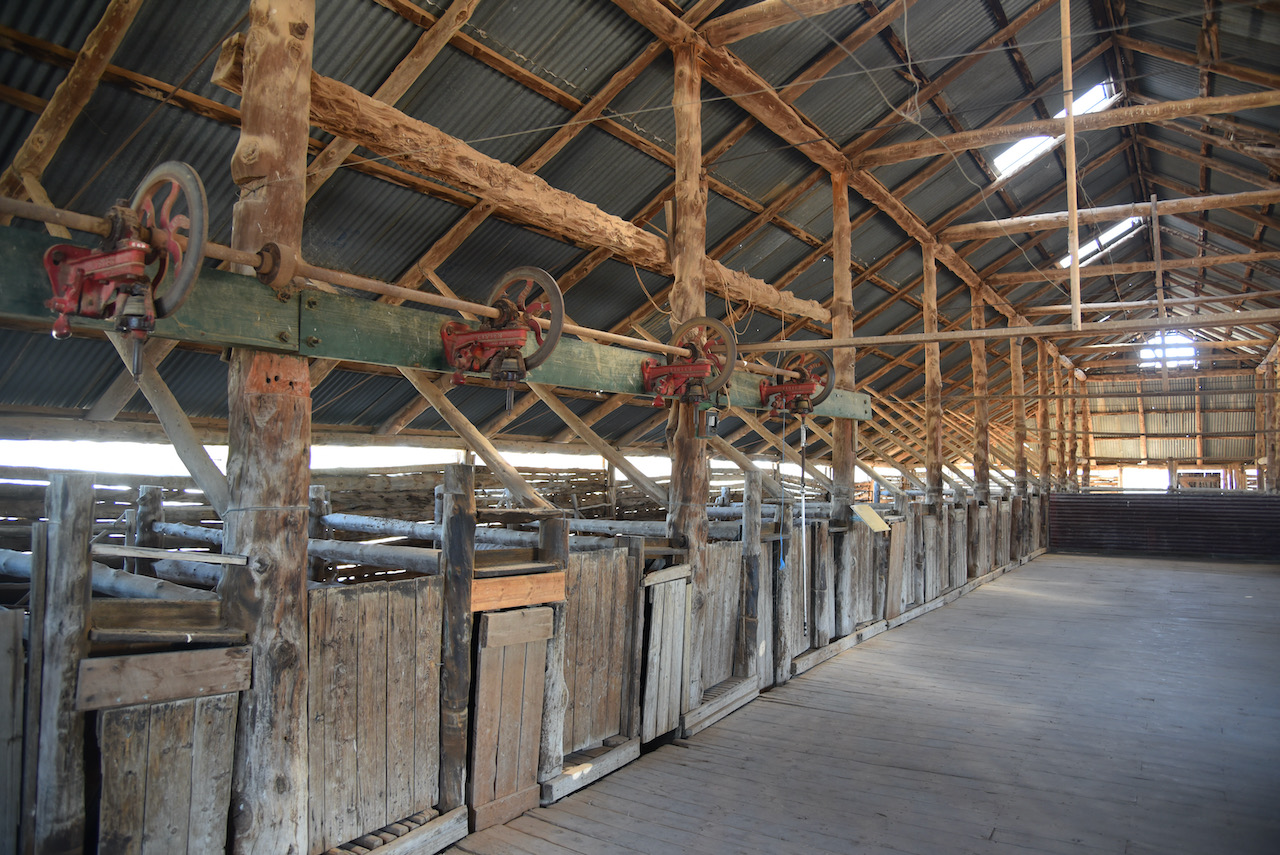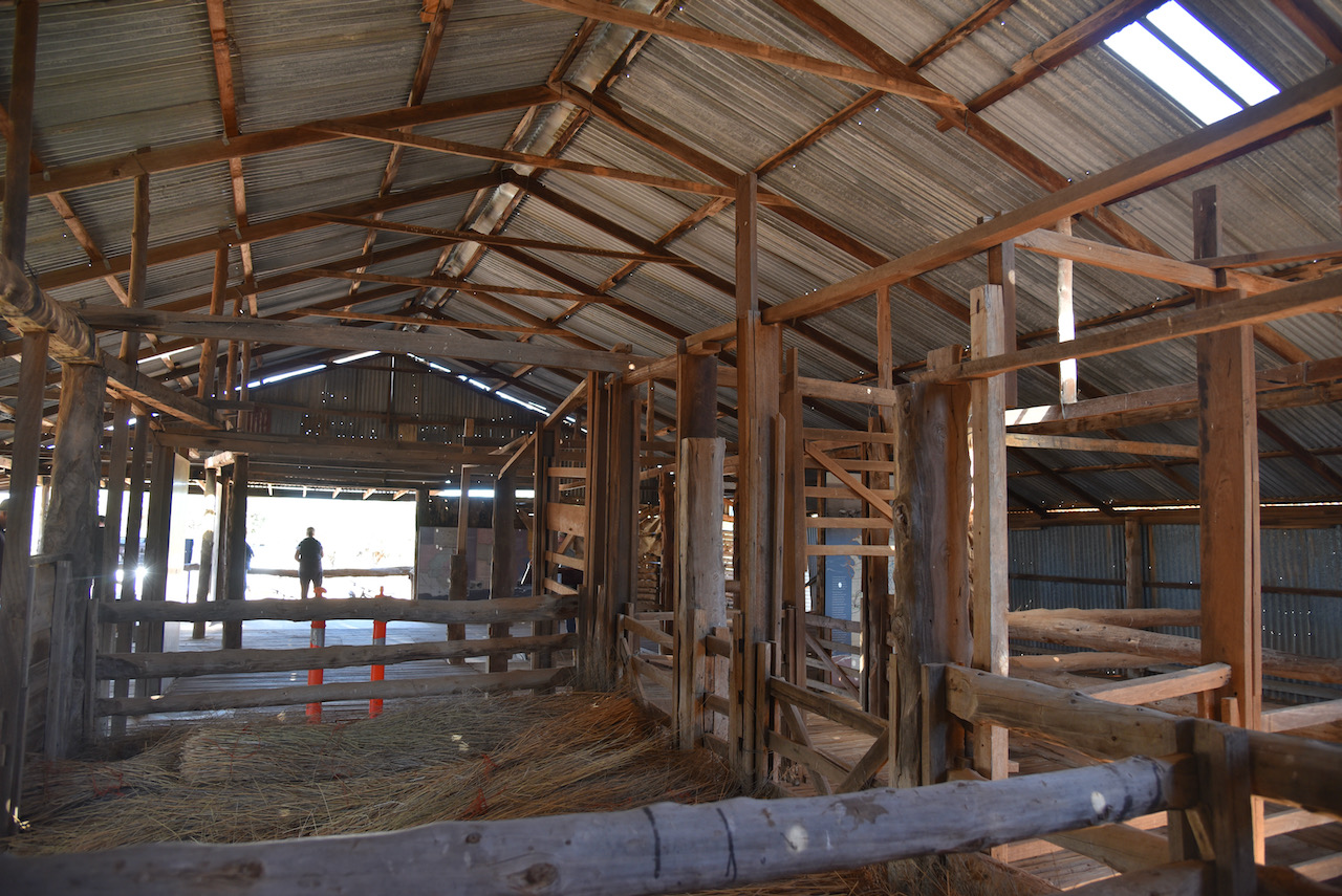 The Mungo woolshed is believed to have been built in 1869. Locally obtained materials were used in its construction as vast distances from freightheads added to the cost. Murray Pine was cut locally and used for the framework and walls. Nails and spikes were forged in the station smithy to pin the frame and walls together. Mallee sticks cut on the station provided material for solid pen gates in the shed.