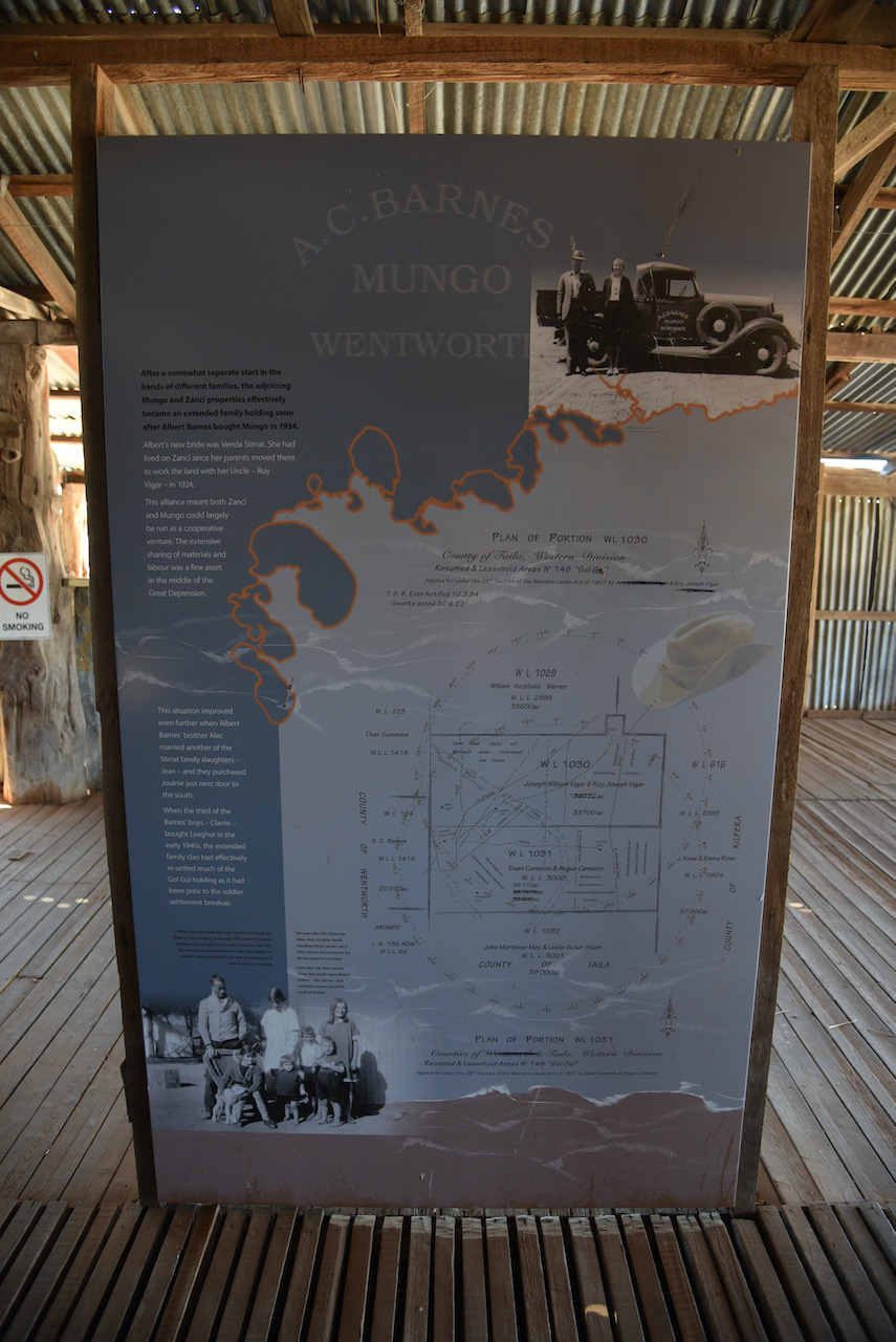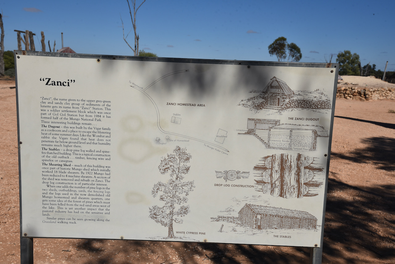 Our next stop was the old Zanci homestead. This was a soldier settlement block which was once part of Gol Gol Station. SInce 1984 it has formed half of the Mungo National Park. Three interesting buildings remain at Zanci, the dugout, the stables, and the shearing shed.