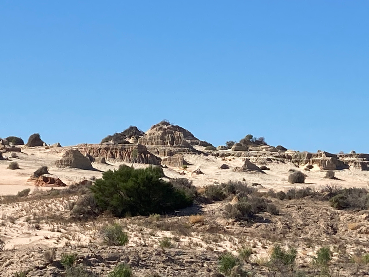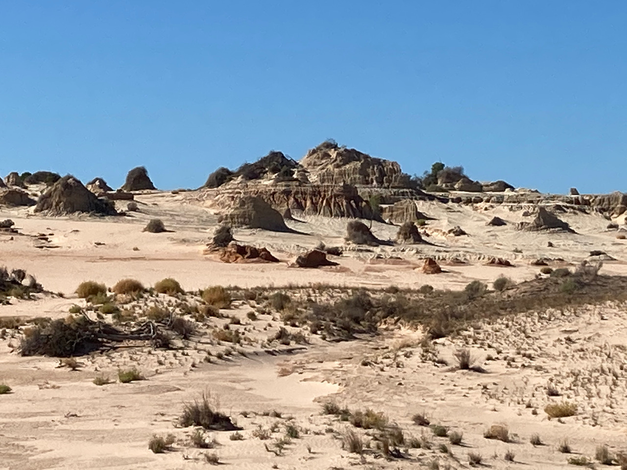 We then drove out to The Walls of China, one of the world’s most signficant archaelogical sites. The Walls of China are a unique feature on the south-eastern edge of what is known as the Lake Mungo lunette. A lunette is a wind formed crescent dune shape