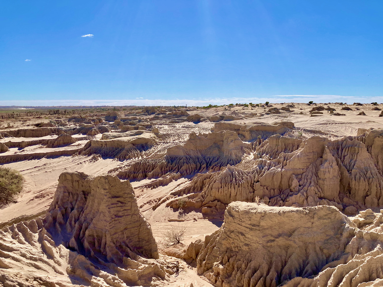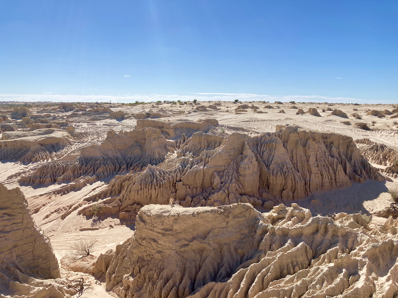 There is a boardwalk here with interpretive signs explaining the history of the formations of the Walls of China. Rain has washed away the soft sand and mud of the lunette, creating characteristic ridges and cracks.