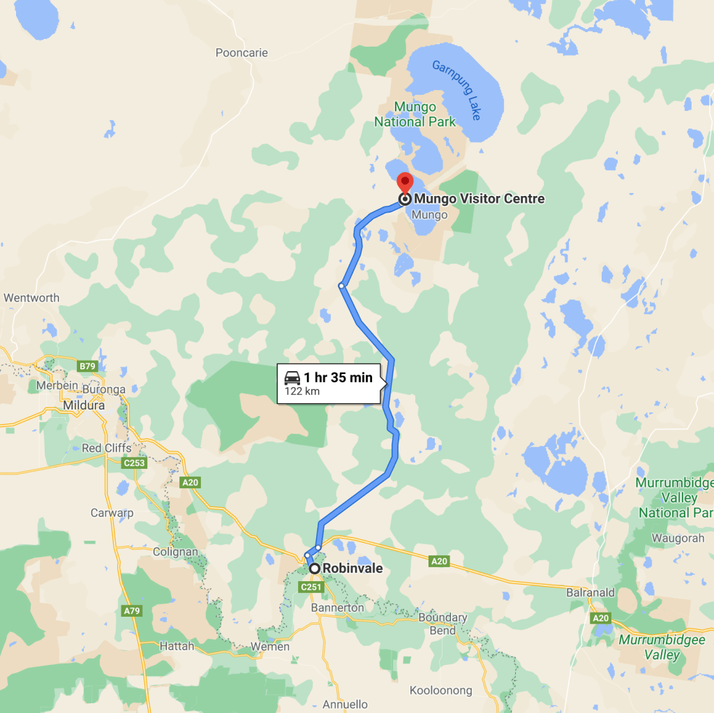 We were getting towards the end of our trip and it was now day eleven (Friday 16th April 2021). Our plan today was to head out to the Mungo National Park in outback south-western New South Wales. Mungo is about 990 km west of the city of Sydney.