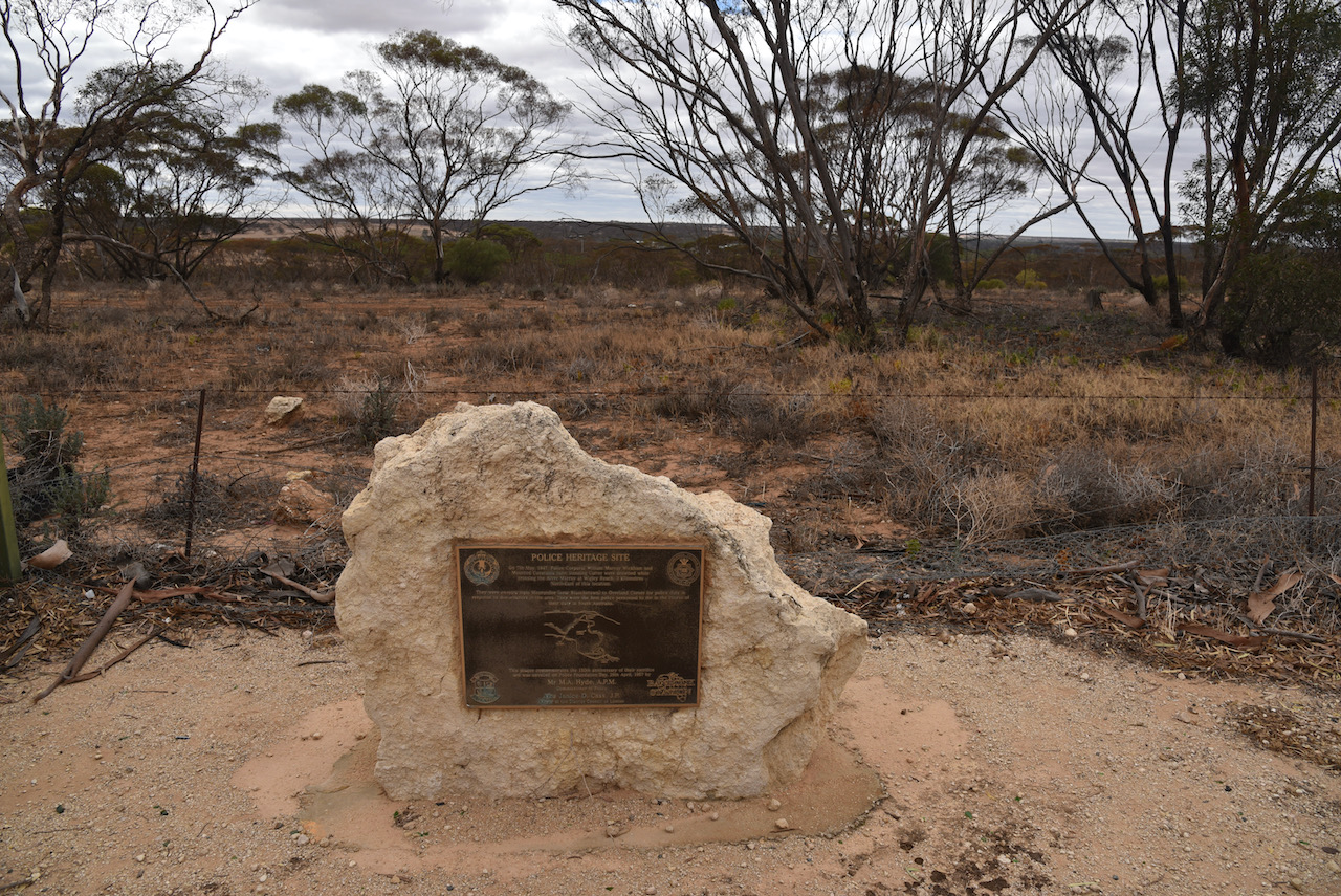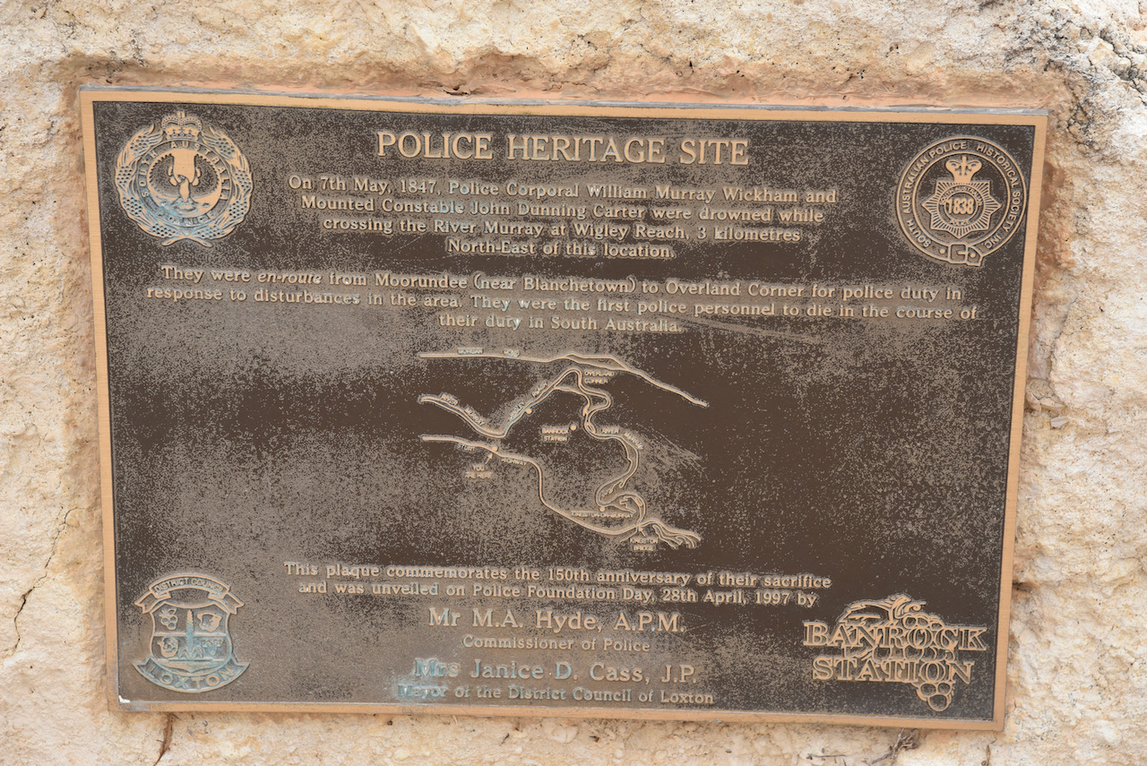 After packing up we continued west on the Sturt Highway and stopped to have a look at the Police Heritage site. The memorial cairn commemorates police officers, Corporal William Murray Wickham and Mounted Constable John Dunning Carter, who drowned on the 7th day of May 1847. They were enroute from Mourundee, near Blanchetown, to Overland Corner for police duty in response to disturbances in the area. They were the first police to die in the line of duty in South Australia.