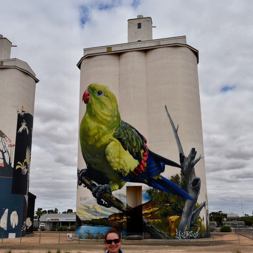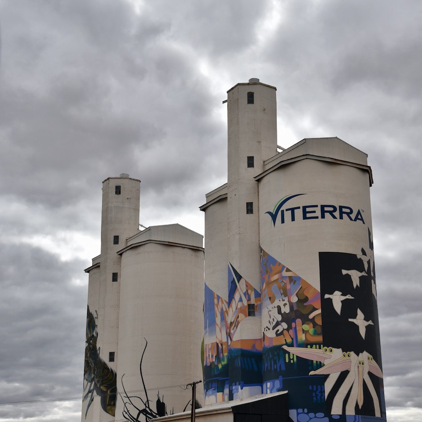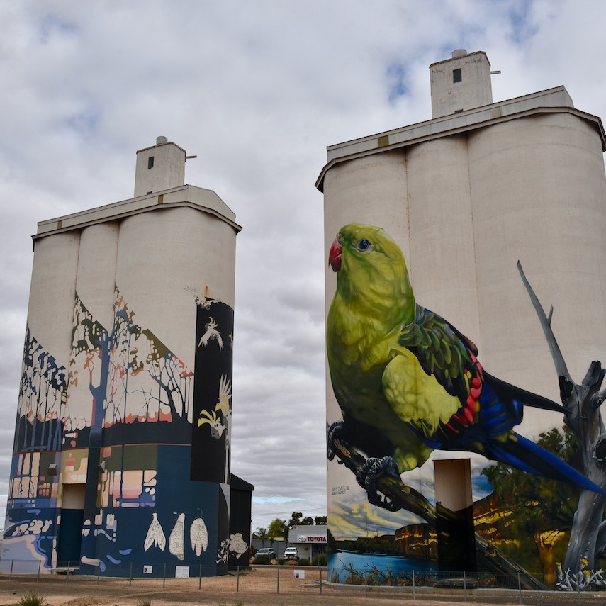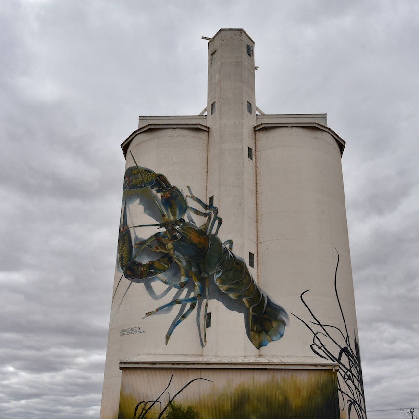 Featured on the silos is a giant Yabby, the endangered Regent Parrot, Murray Hardyhead and the Spiny Daisy.