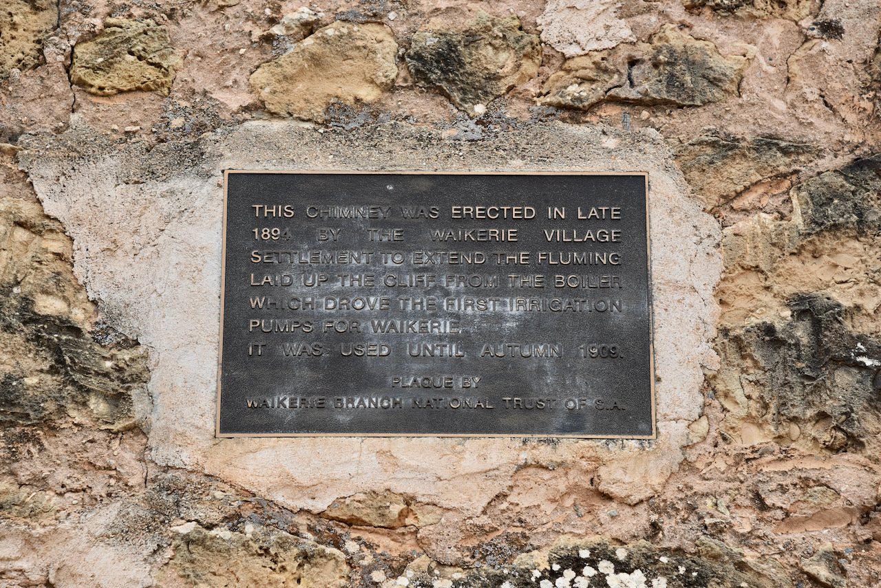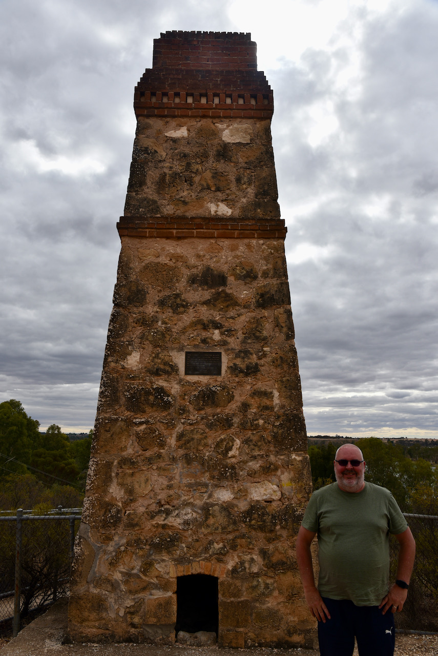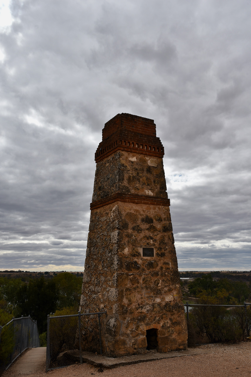 We then had a look at a historic old stone chimney at Waikerie overlooking the Murray River. The chimney was erected in late 1894 by the Waikerie village settlement to extend the fluming laid up the cliff from the boiler which drove the first irrigation pumps for Waikerie. It was used until Autumn 1909.