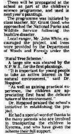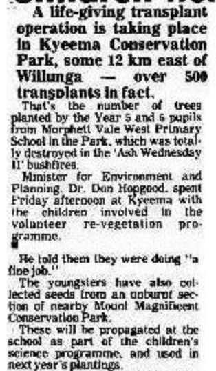 The park was significantly damaged during the devastating Ash Wednesday bushfires in February 1983. Following the fires, the park became the focus of a large revegetation project involving local school students. About 20,000 seedlings were planted in the first three years after commencement of the project. This area is now known as ‘The Childrens Forest’.