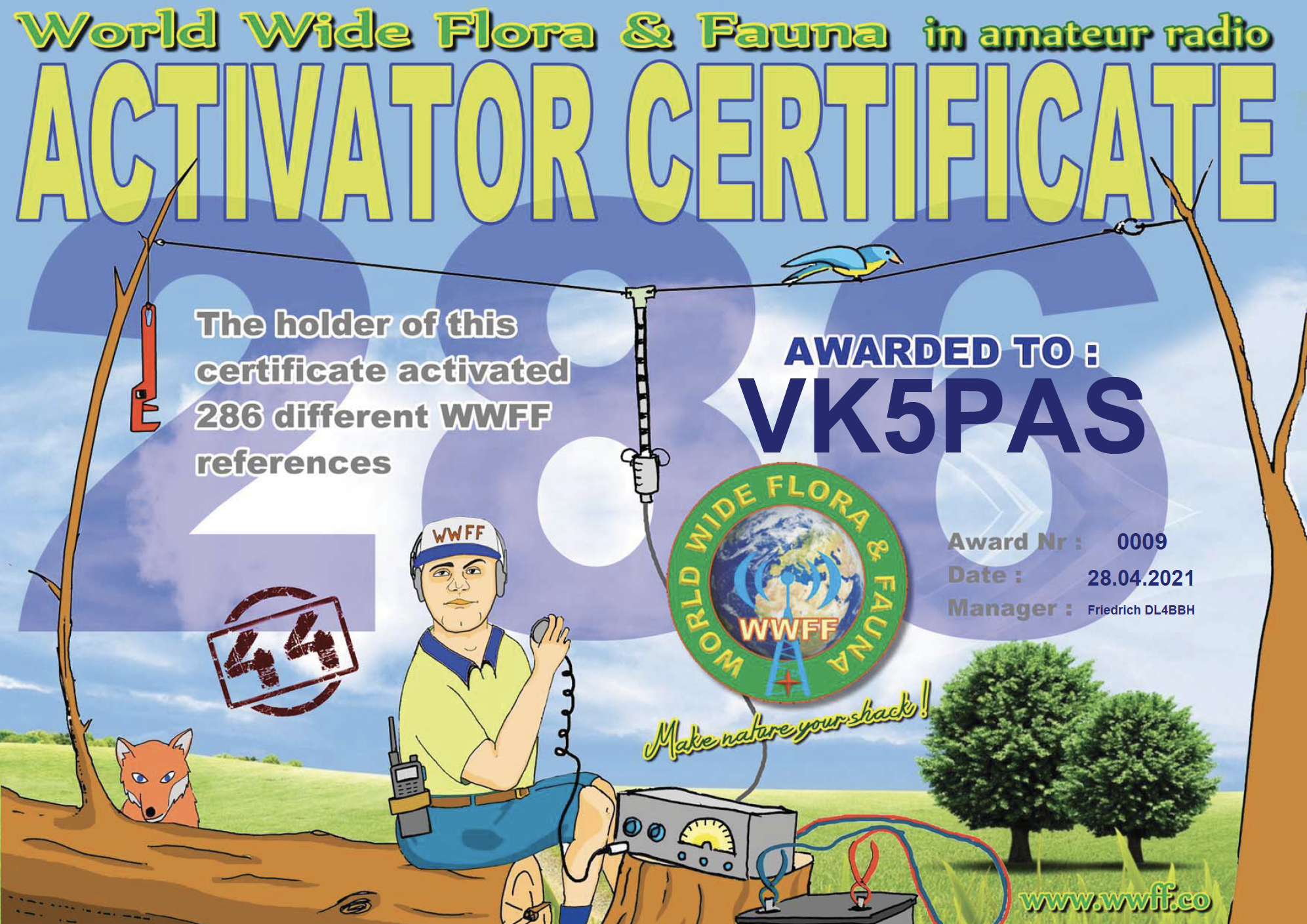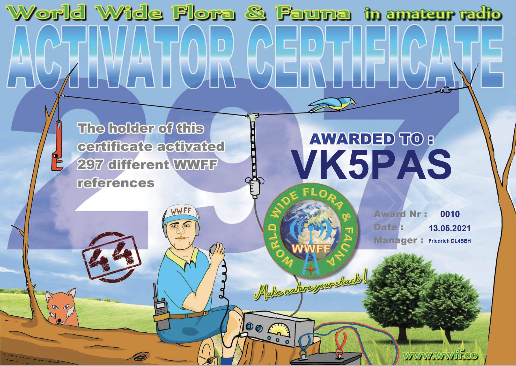 I have also qualified for a couple of new WWFF Global Activator certificates. Issued for having activated 286 and then 297 WWFF references. Each of those activations have a minimum of 44 QSOs.