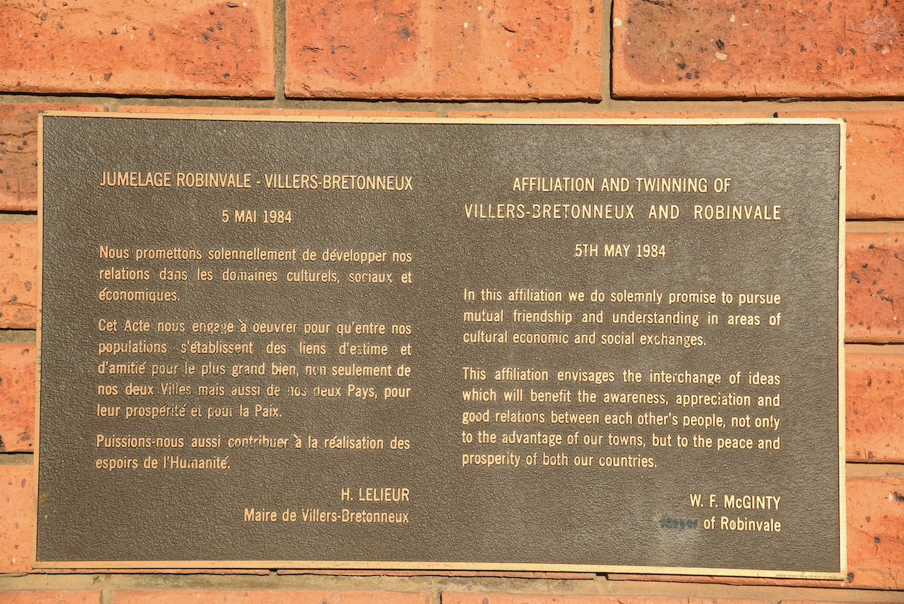 In the main square/park of Robinvale you can find Caix Square and the Robinvale Memorial Arch and the Villers Bretonneux Walk. The arch was opened in 1985 by Madame Huguette Pillon. The bell which can be found at the top of the arch is from the Victoria College at Villers-Bretonneaux. It was presented to the people of Robinvale at the ‘twinning’ ceremony in Villers-Bretonneaux on the 5th May 1984.