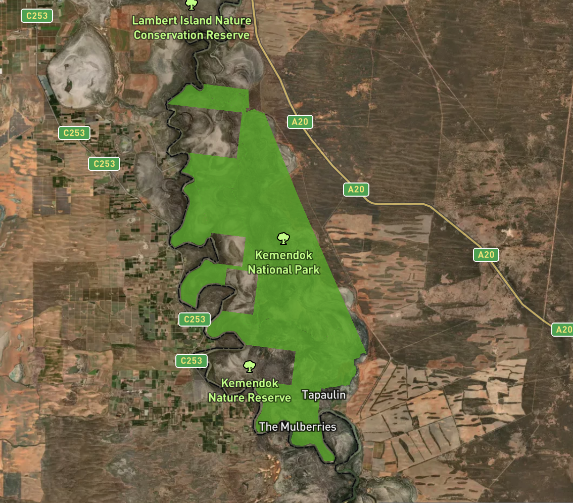 The Kemendok National Park is located on the far west of New South Wales, about 40km south-east of Buronga and about 36 km north-west of Euston. The western boundary of Kemendok is defined by the Murray River (the State border between New South Wales and Victoria).