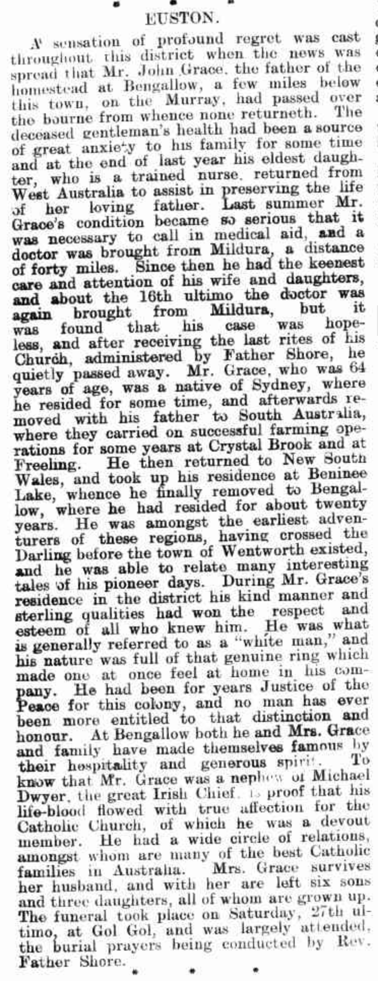 Above:- Newspaper article re the death of John Grace, from the Freeman’s Journal (Sydney) Sat 17 Aug 1901. Image c/o Trove