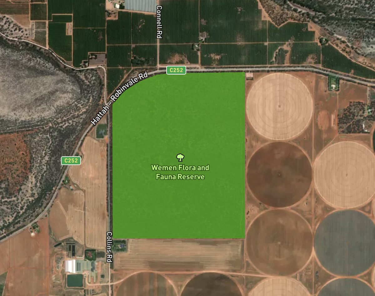 The Wemen Flora & Fauna Reserve is about 2.02 km² in size and was established in 1983. The area around the park has been cleared for agricultural purposes including almond and olive plantations.