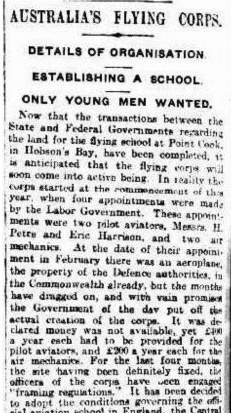 The Point Cook Aviation School was established on the 15th day of February 1914, under the supervision of Major E. H. Reynolds, assisted by Captain Henry Petre (an Englishman) and Lieutenant (to become Captain) Eric Harrison (an Australian). It was reported that ‘all of whom received a thorough training in England‘.