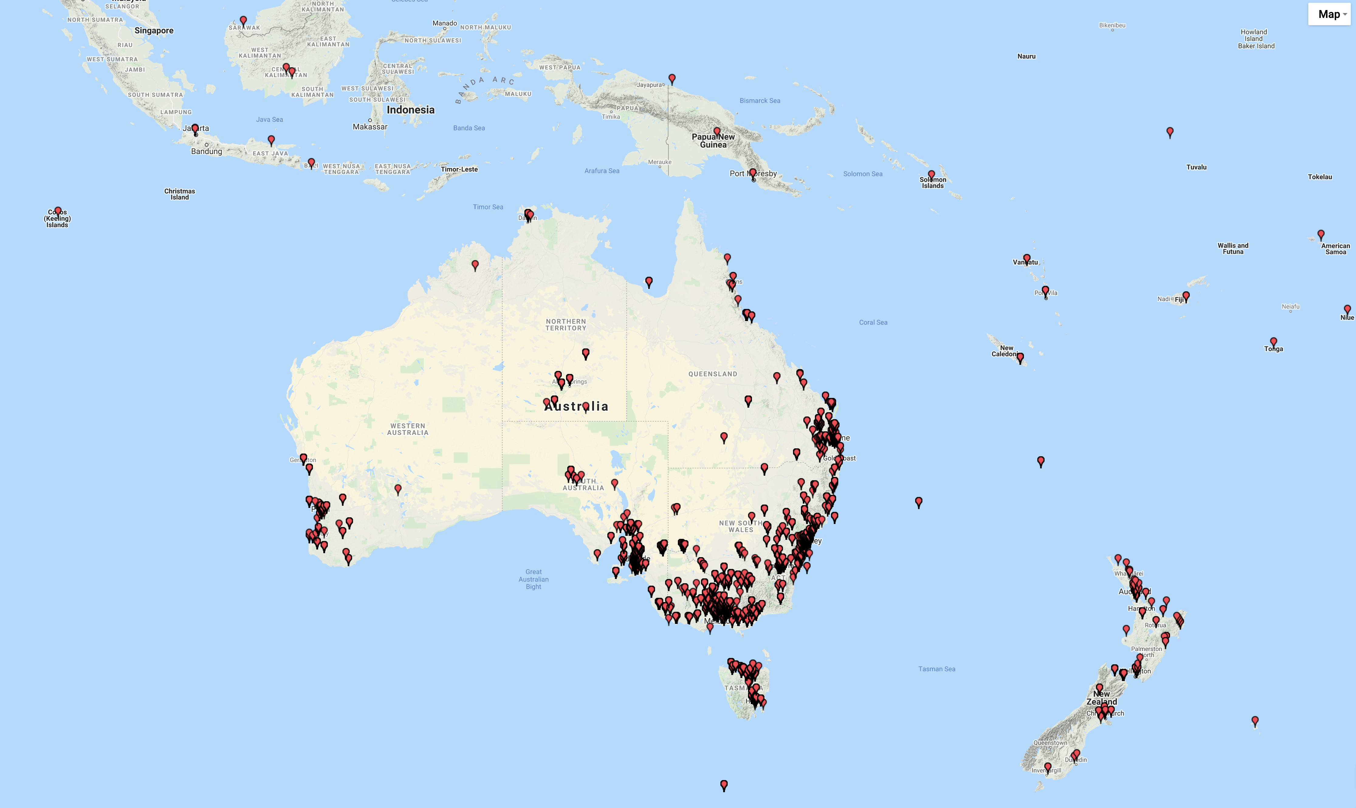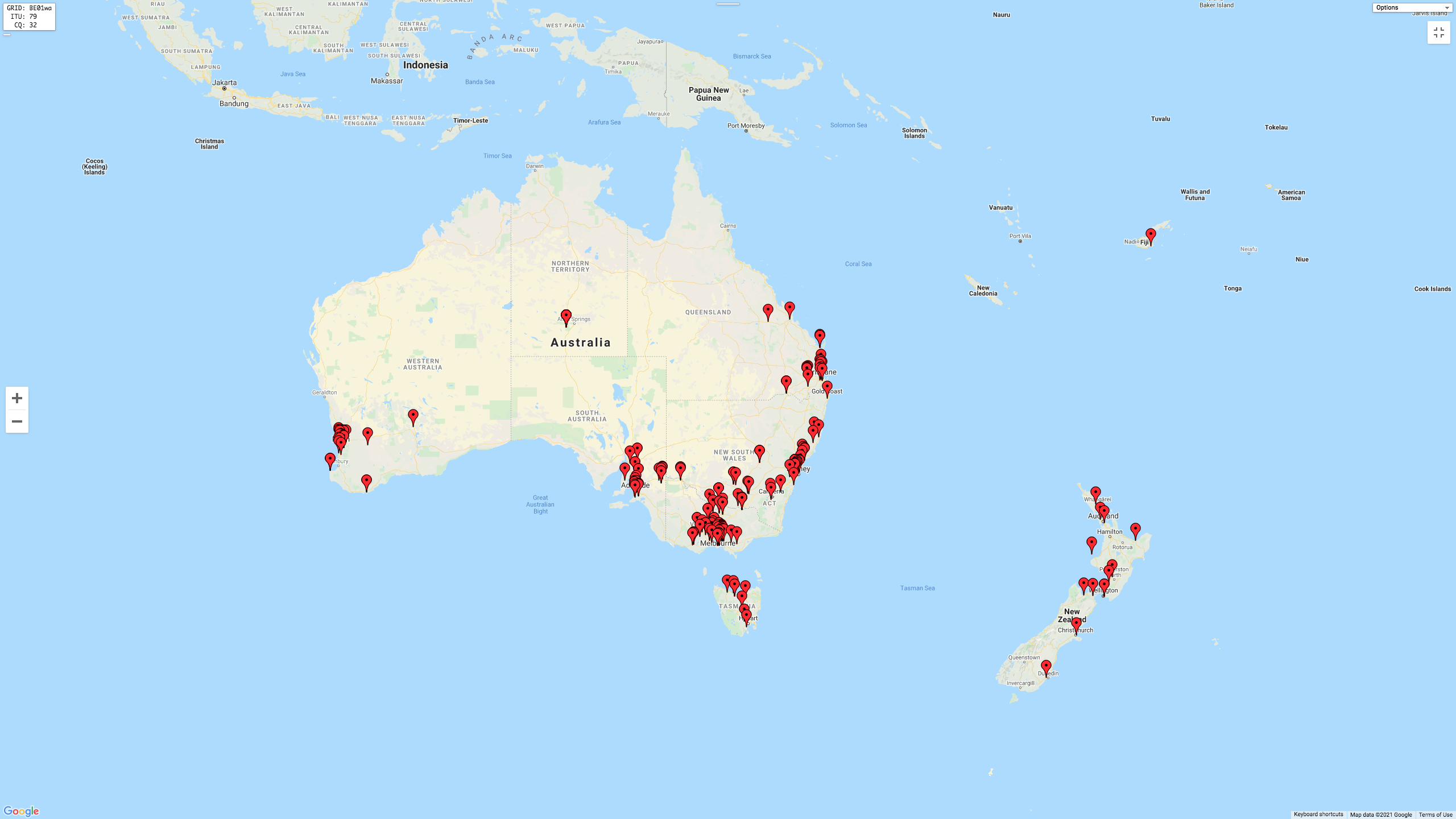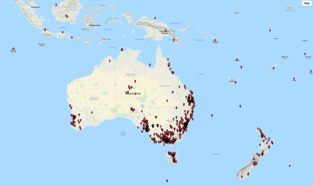 The map below shows my contacts around Australia and New Zealand.