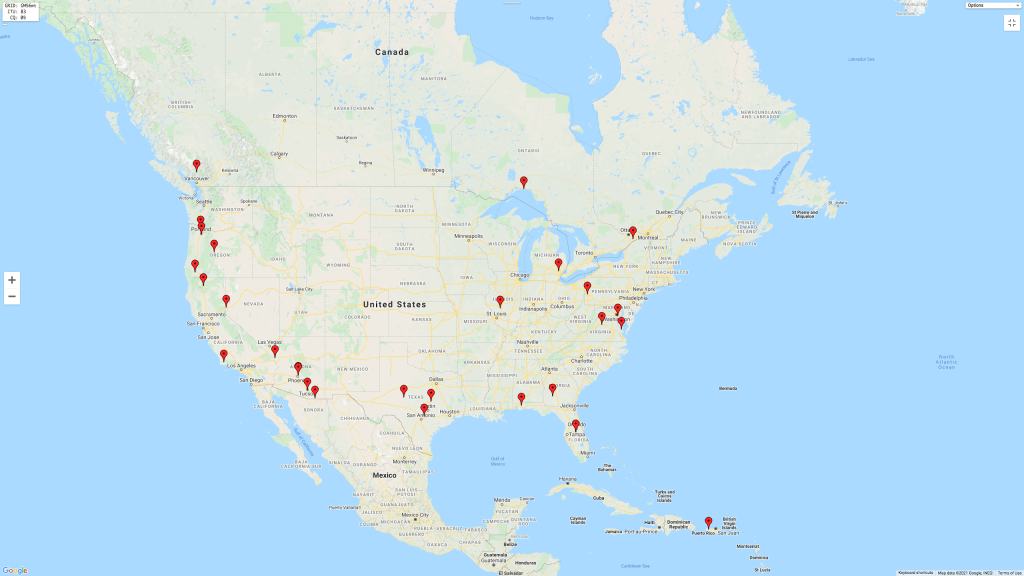 Above:- Map showing our contacts into the USA & Canada.
