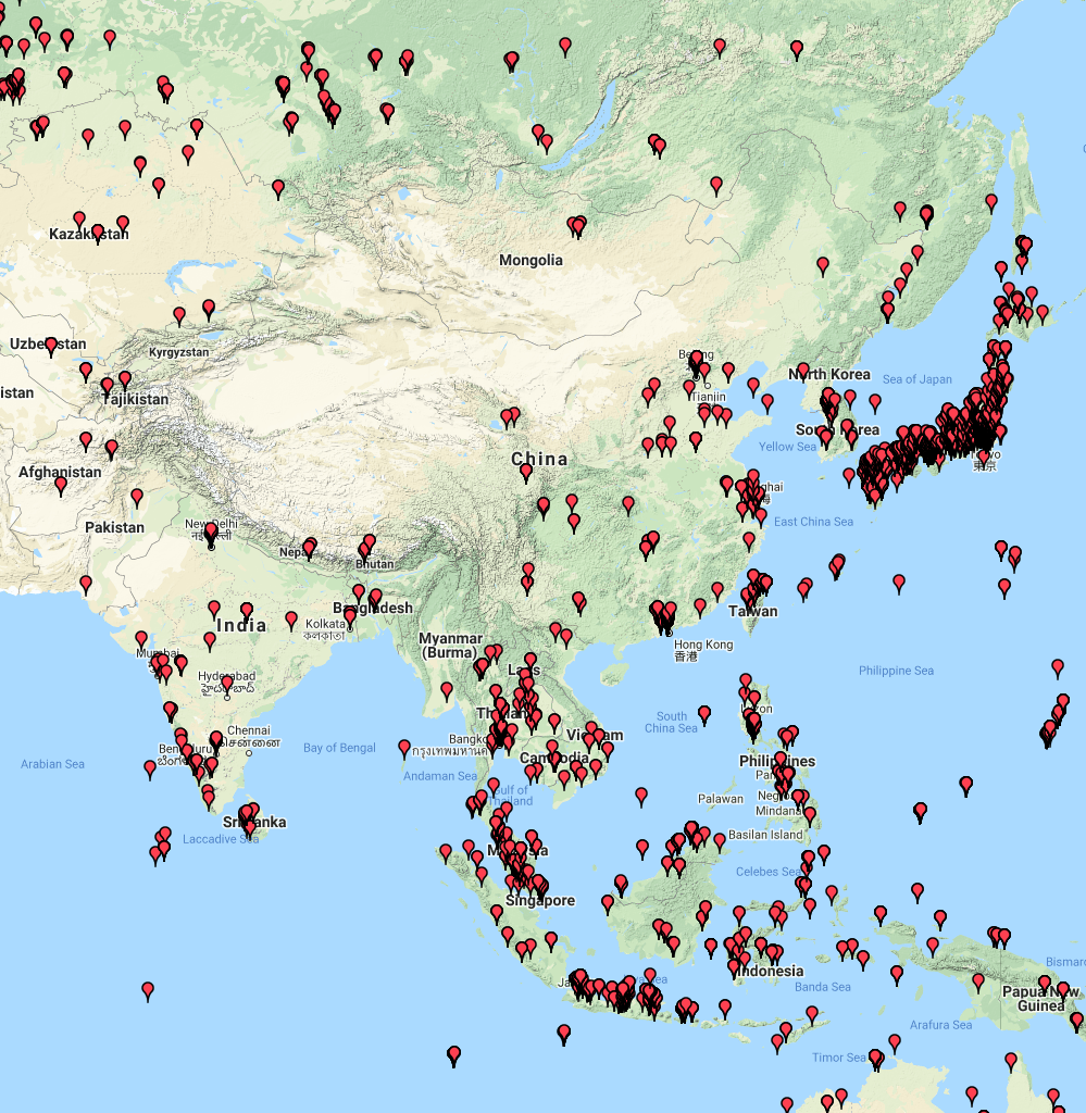 The map below shows my contacts around Asia and the sub-continent.