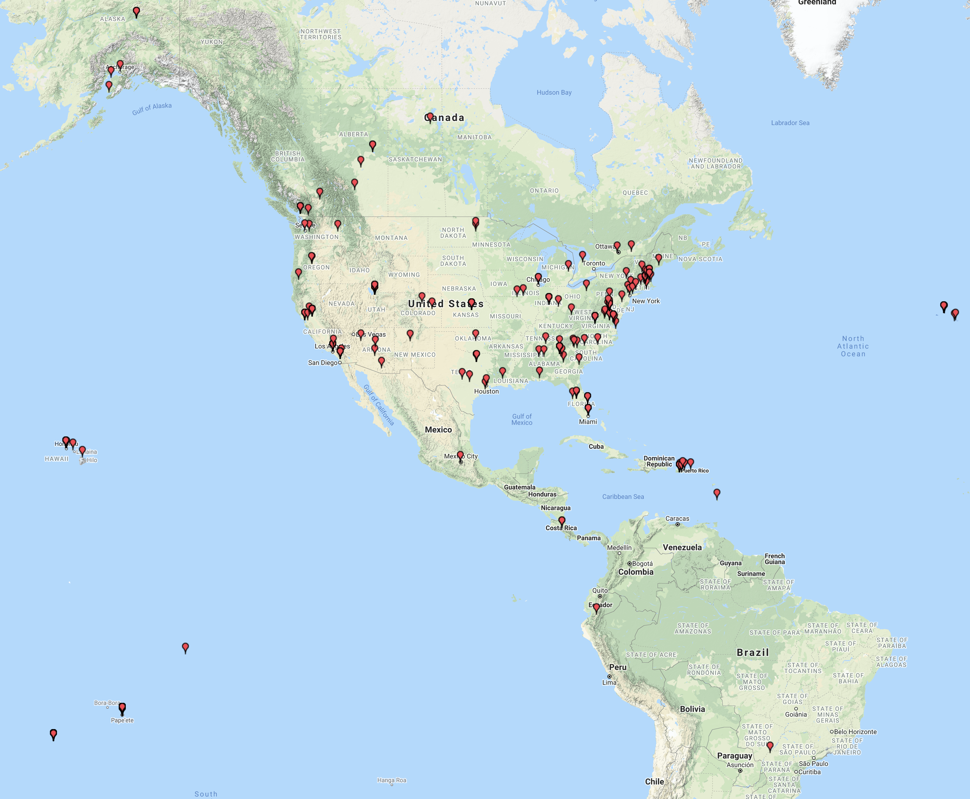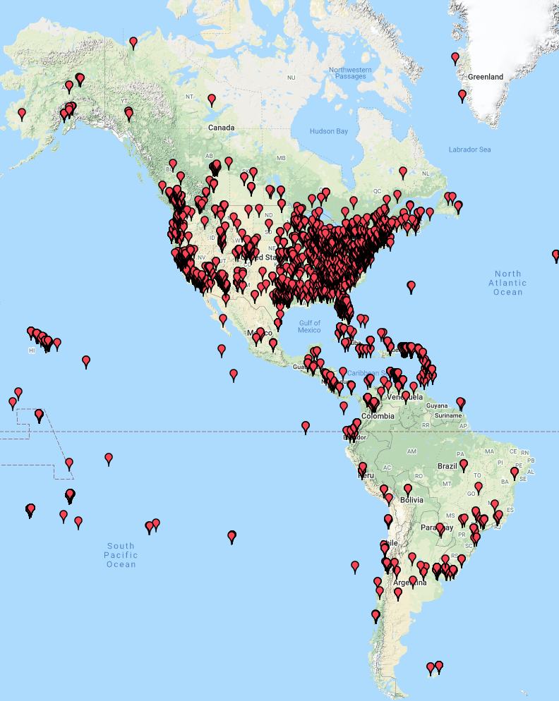 The map below shows my contacts into North America, Central America, and South America.