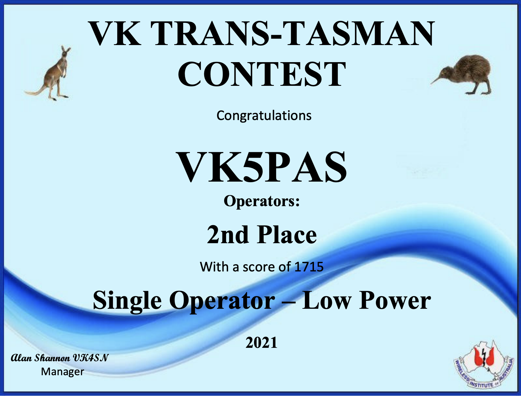 Participants who take part in the contest receive a participation certificate. From 2018 this contest is an official Wireless Institute of Australia (WIA) Contest and will count towards the Peter Brown Contest Champion Awards.