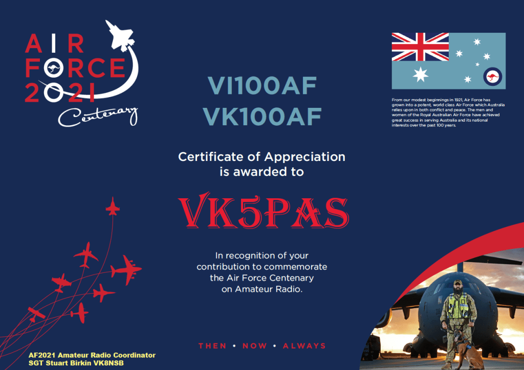 Received these certificates today from Stuie VK8NSB for our participation using the VK100AF and VI100AF callsigns for the 100-year celebration of the Royal Australian Air Force.