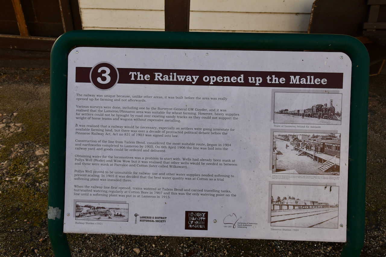 Trains once ran to Lameroo on the Tailem Bend to Pinnaroo line. Construction of the lie commenced in 1904. Earthworks were completed to Lameroo by 1905. The first trains arrived with passengers and goods commenced arriving in 1906, with the line laid into the railway yard on the 6th day of April 1906. The Lameroo railway station was declared open on the 14th day of September 1906.
