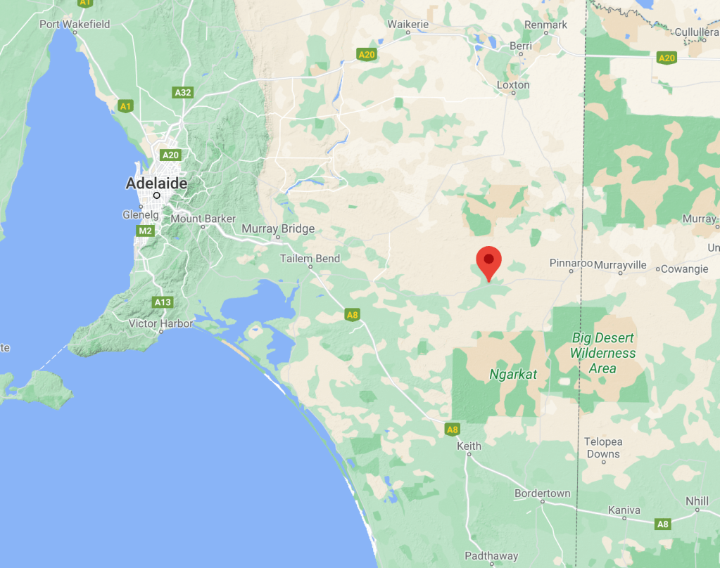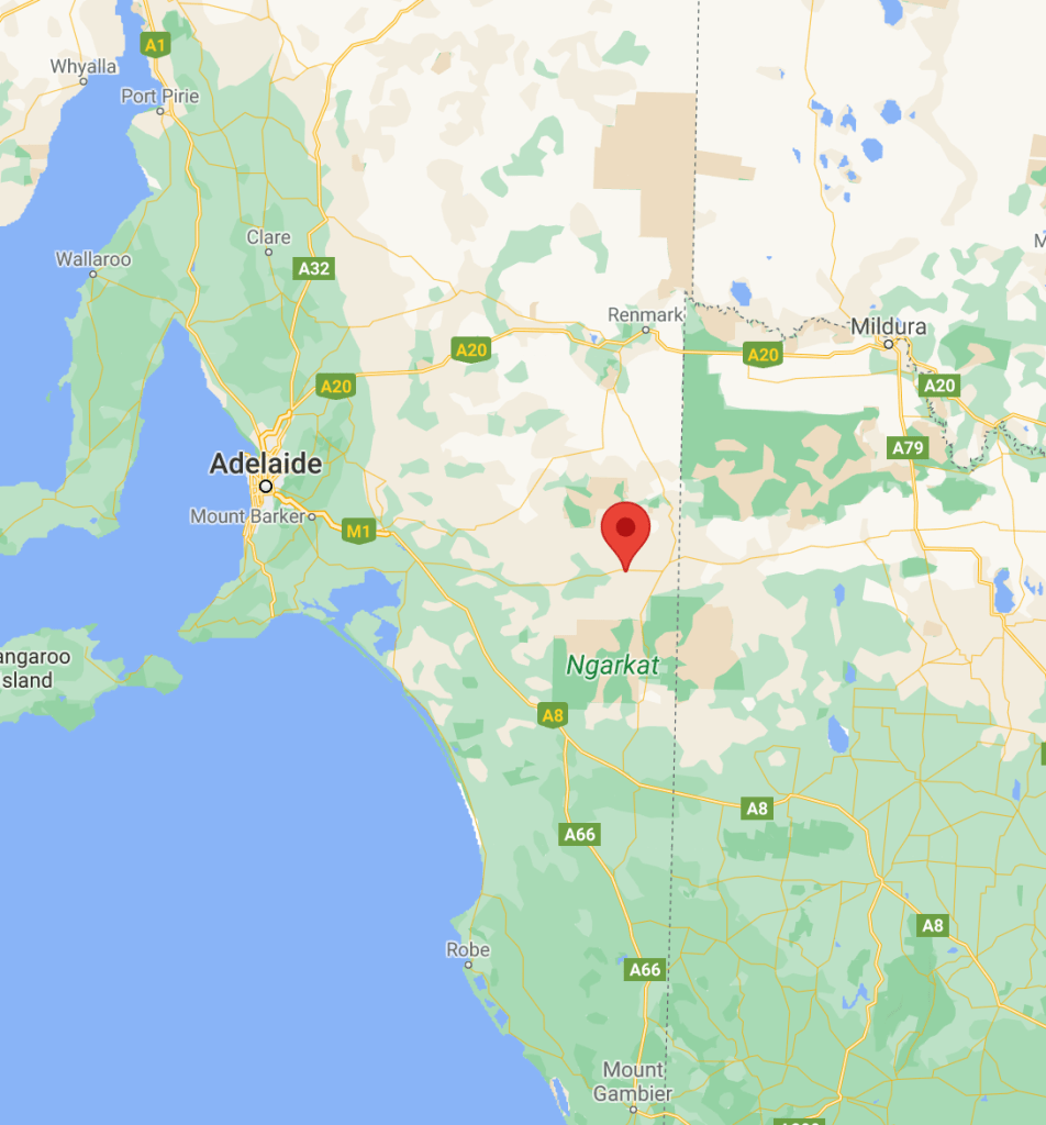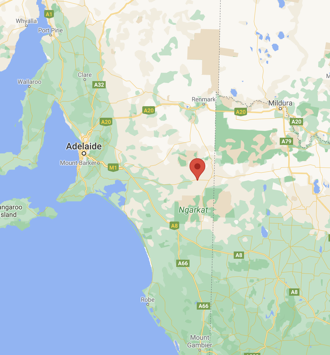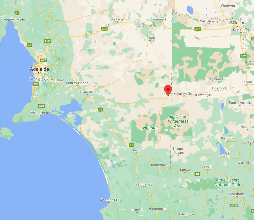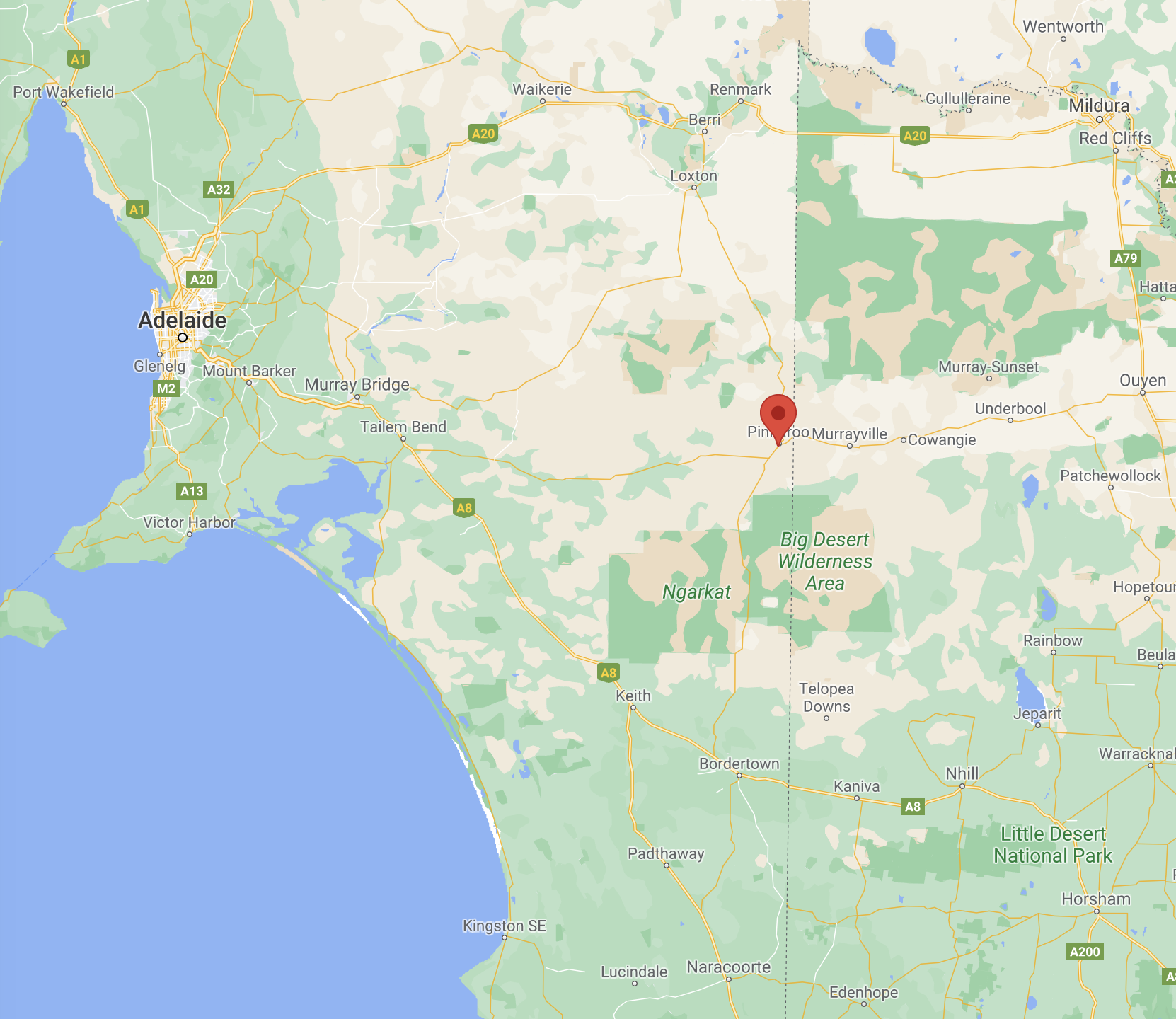 Above:- Map showing the location of Pinnaroo. Map c/o Google maps.