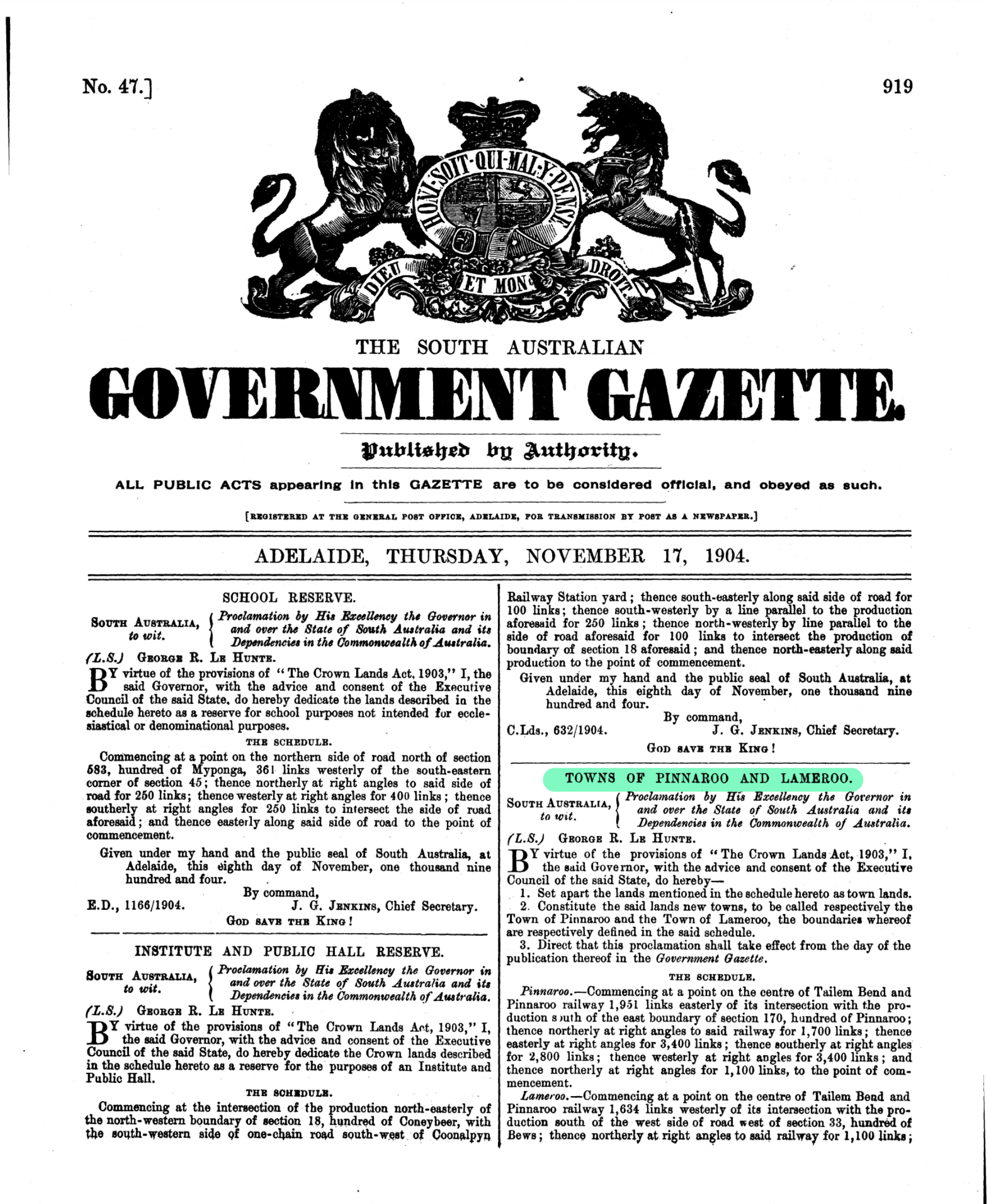 Above:- The South Australian Government Gazette, Thursday 17th November 1904.