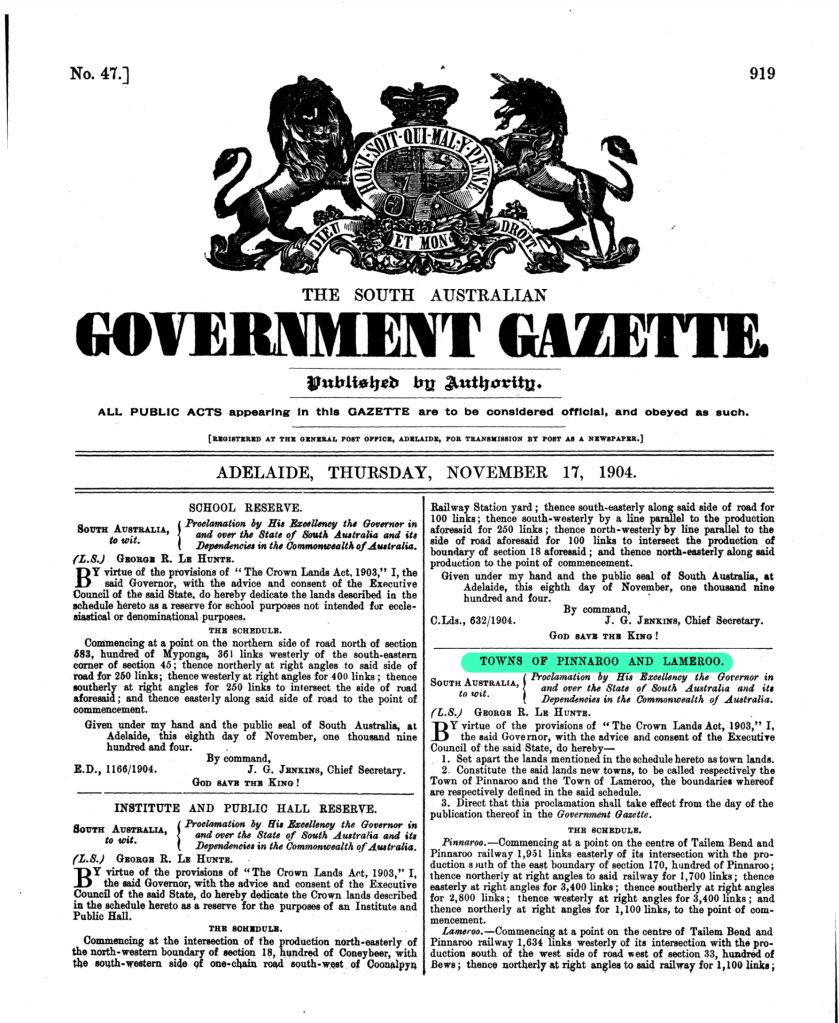 In 1885, the Commissioner of Crow Lands, Mr. Playford, and the Surveyor-General, Mr. G.W. Goyder, explored the countryside around Pinnaroo and a decision was made to open the land for agricultural settlement. In 1892, several Hundreds were surveyed. The Hundred of Pinnnaroo was proclaimed on the 4th day of January 1894. A Correspondent reported:-
