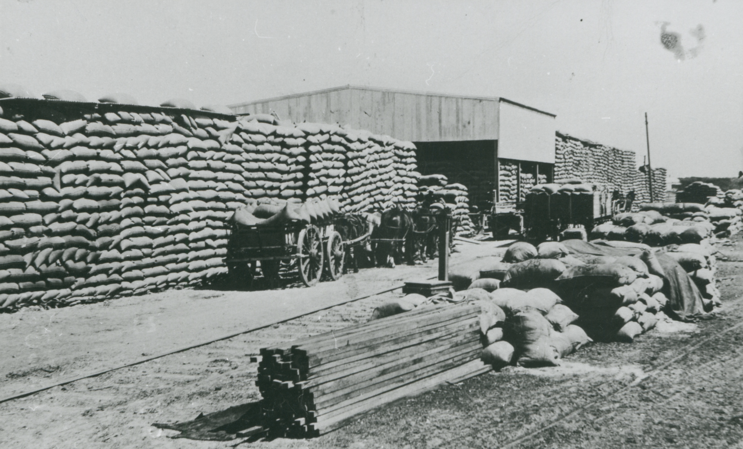 Prior to the advent of Bulk Handling all grain was handled in bags and it was a common sight to see huge stacks awaiting transport in the railway yard.