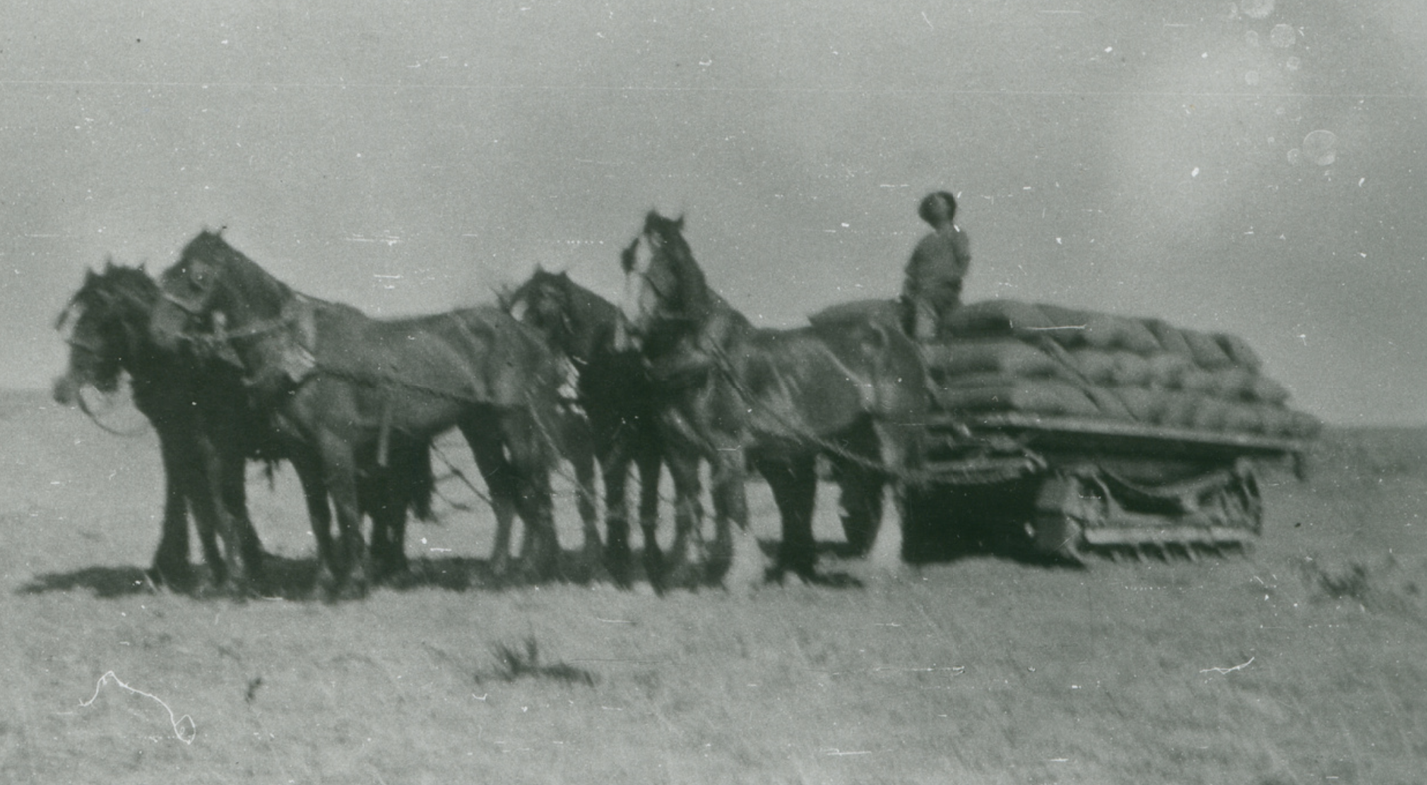 Above:- Unloading wheat sacks from horsedrawn wagons at Lameroo.