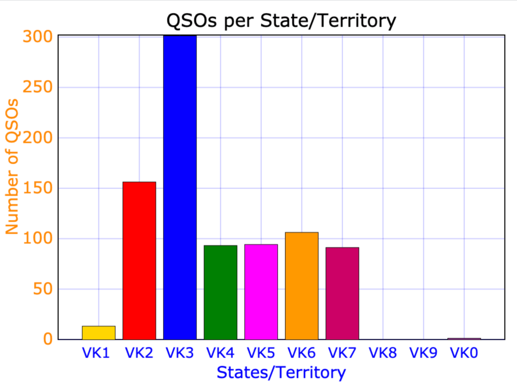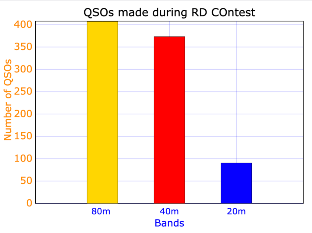 Most of our contacts were on the 40m band as can be seen in the graph below.