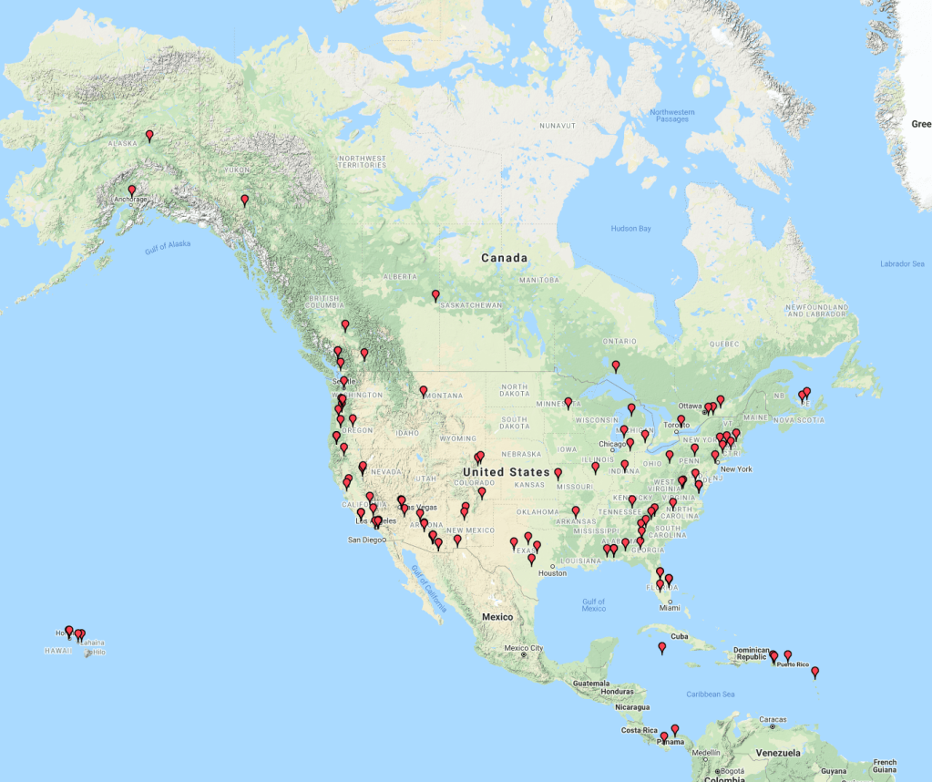 The map below shows our contacts into North America and the Carribean.