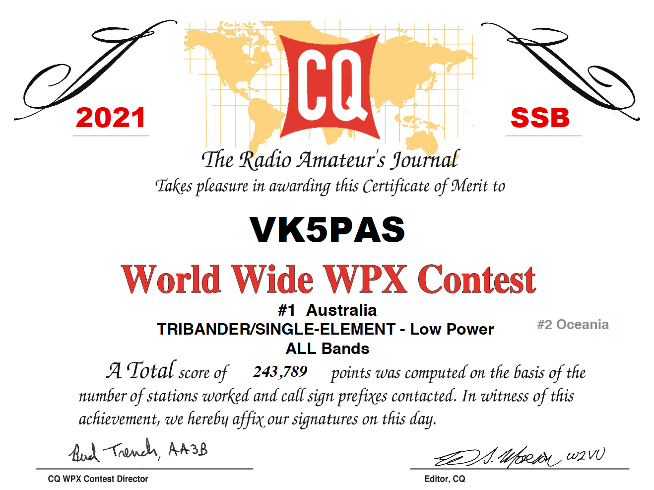 And this is the certificate in the overlay category – Tribander (10, 15, 20m) and single element for 40 & 80m. I came 1st in Australia and 2nd in Oceania.