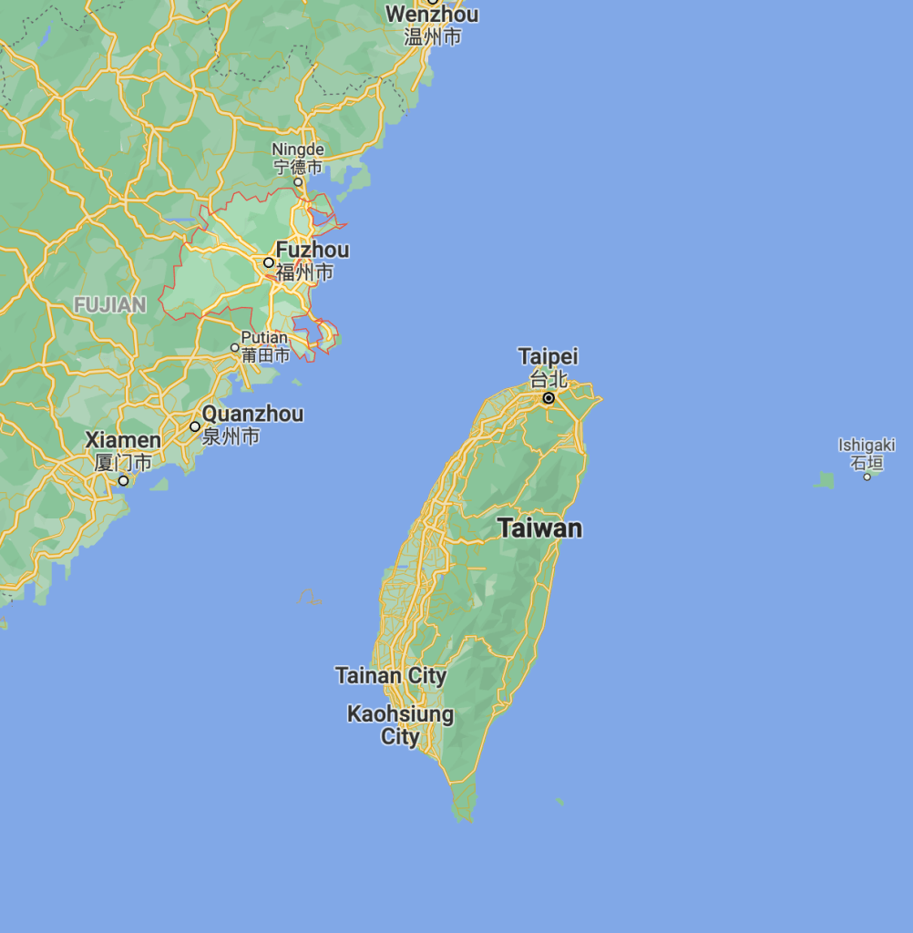 Above:- Map showing Fuzhou City in China and Taiwan. Map c/o Google maps