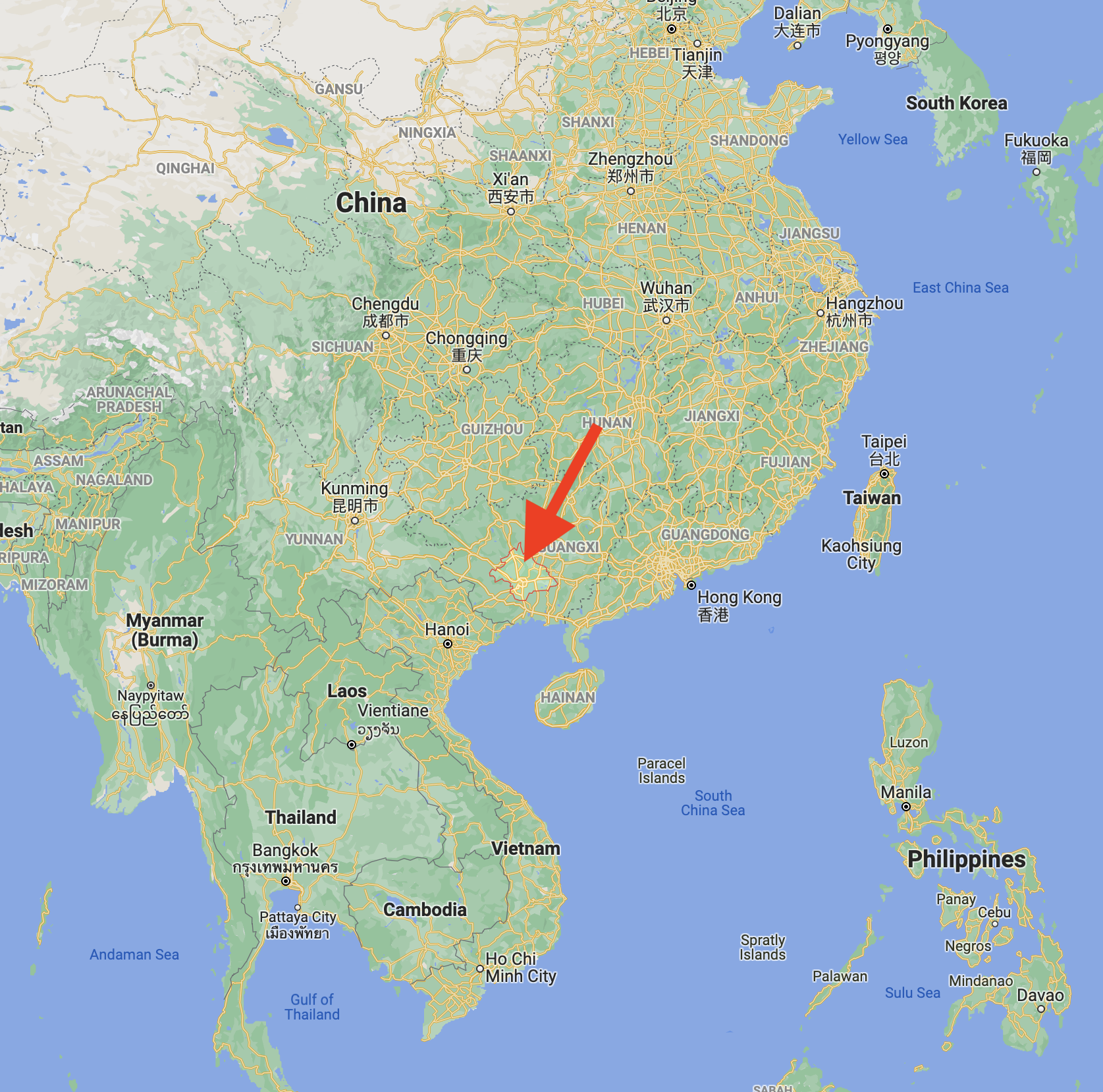 Above:- Map showing the location of Nanning in China. Map c/o Google maps
