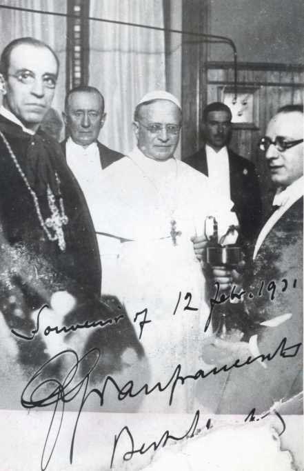 Above:- Pope Pius XI, his successor Pacelli with Marconi at starting of Vatican Radio 1931. Image c/o Wikipedia